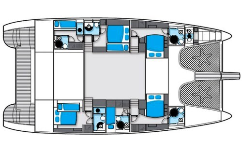 Luxury 2008 Sunreef 70 Catamaran BLUE GURU can accommodate 8 to 12 guests in 5 cabins, two of which can easily be converted into triples. She is available for yacht charters in the Mediterranean and Caribbean. During the summer, she is based in the beautiful Island of Palma de Mallorca and is legal to charter in Spanish waters.