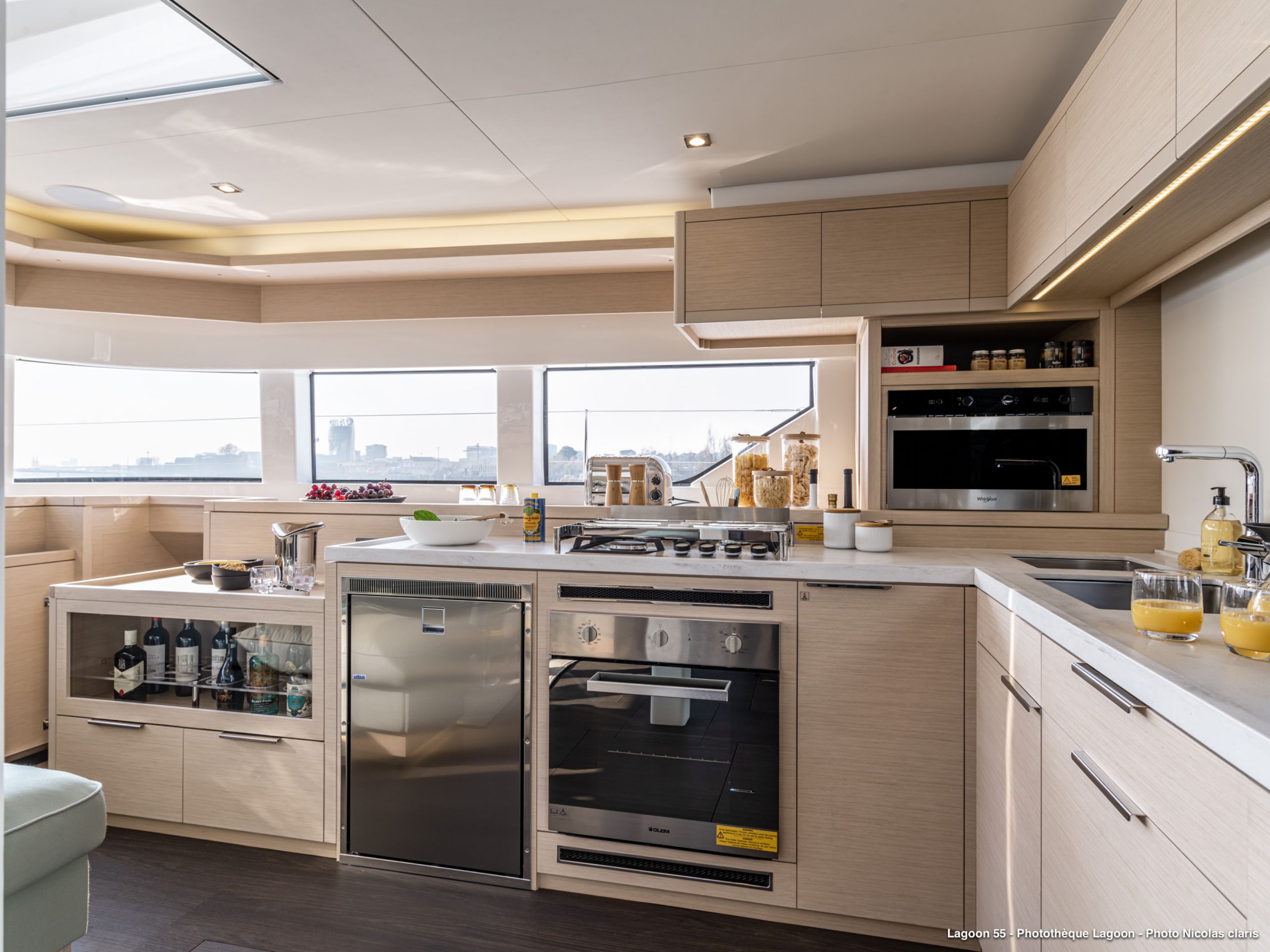 The lower deck offers five luxury ensuite cabins including one master and one VIP in the port side hull and two double and one twin in the starboard hull.