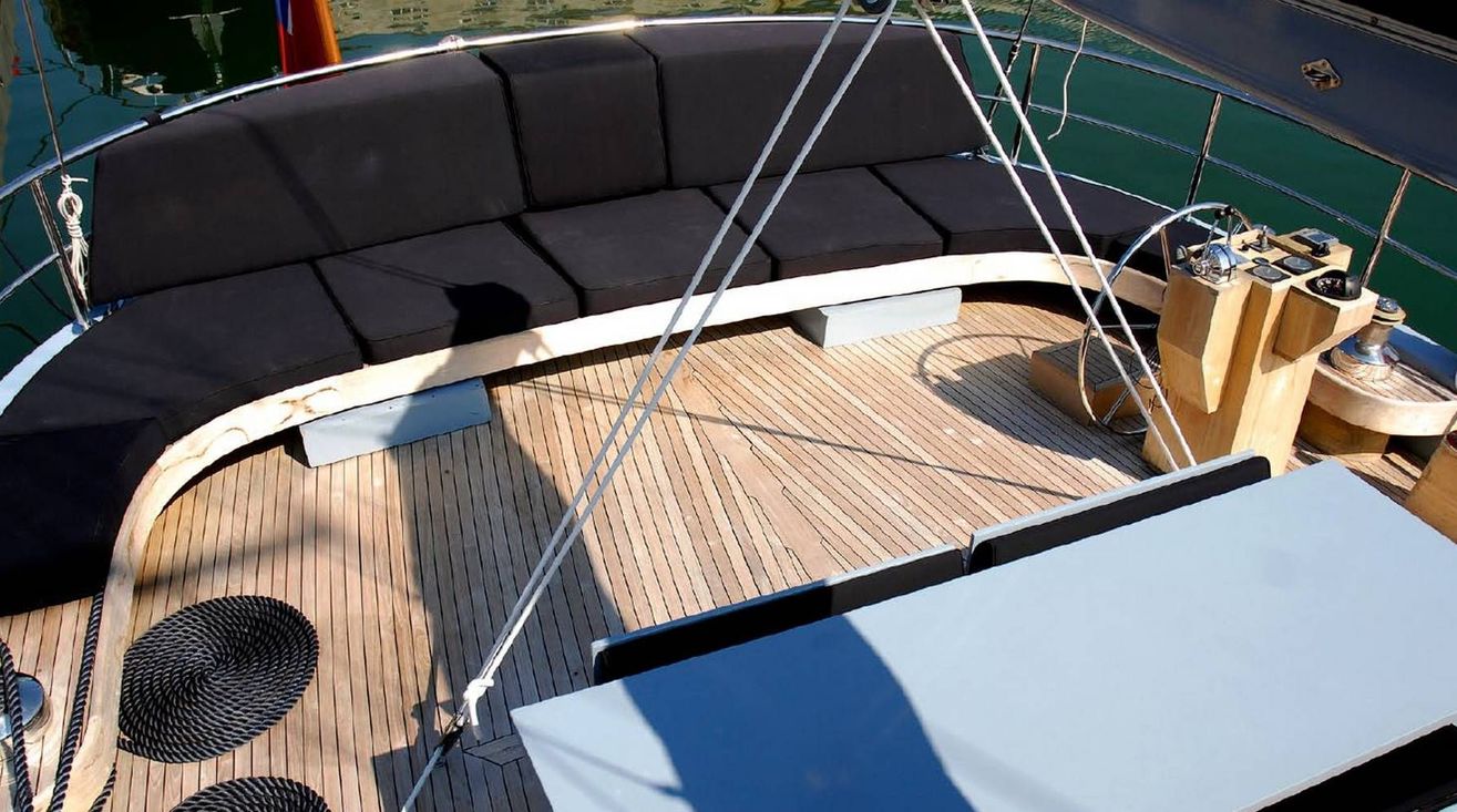 In the cockpit is a 12-person dining table with comfortable sofas surrounding the stern. The external helm station is also present in the cockpit area.