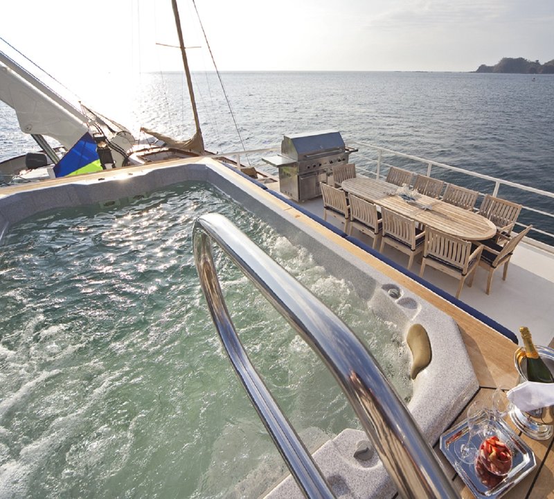 The Owner's deck aft hosts a spacious alfresco lounge comprised of armchairs and drinks tables, which can be arranged into separate seating areas to suit the occasion.