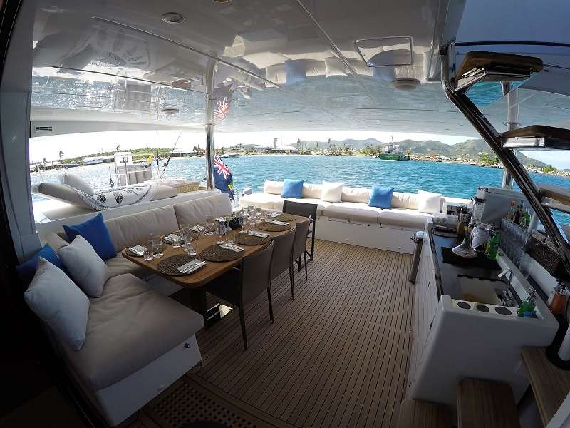 On the main deck, the cockpit has a great lounge space with dining and a full wet bar. Access down to the water on each side enables guests to experience all the water toys on offer or swim to shore when anchored at a beach.
