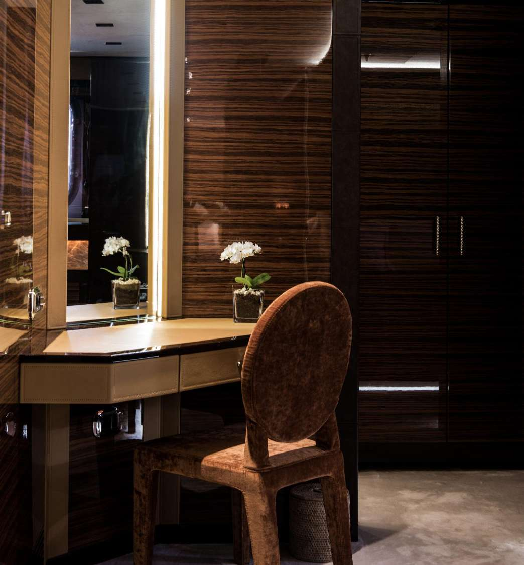 The engine room is behind, and the beach club in the stern has a hammam and gym, and a raised section offering a pair of armchairs and a coffee table for a place to relax beside the sun-exposed swim platform.