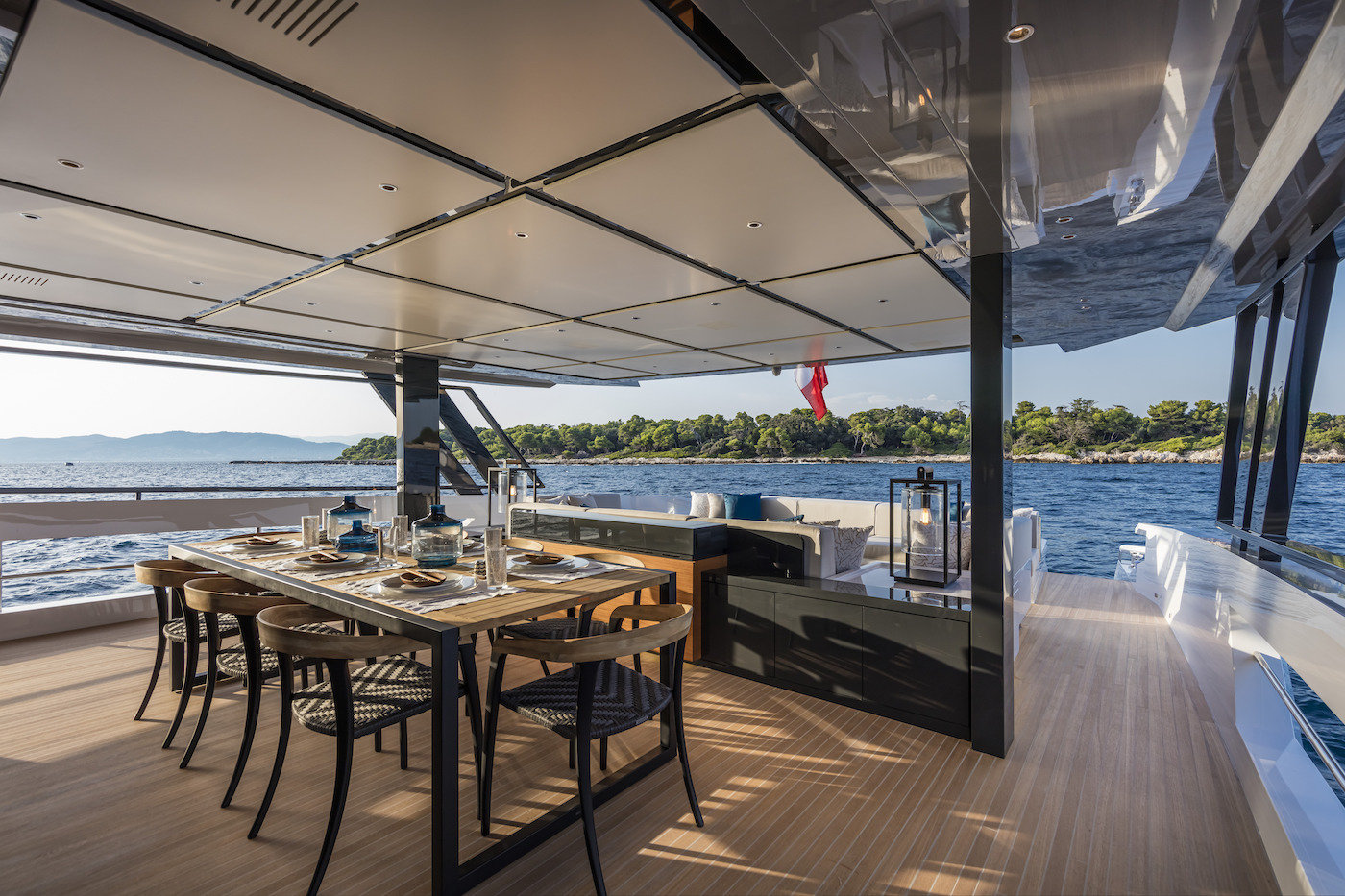The galley is amidships to port, and behind is the formal dining area surrounded by glass to create a winter garden which can remain enclosed or opened to the elements for a more alfresco experience.