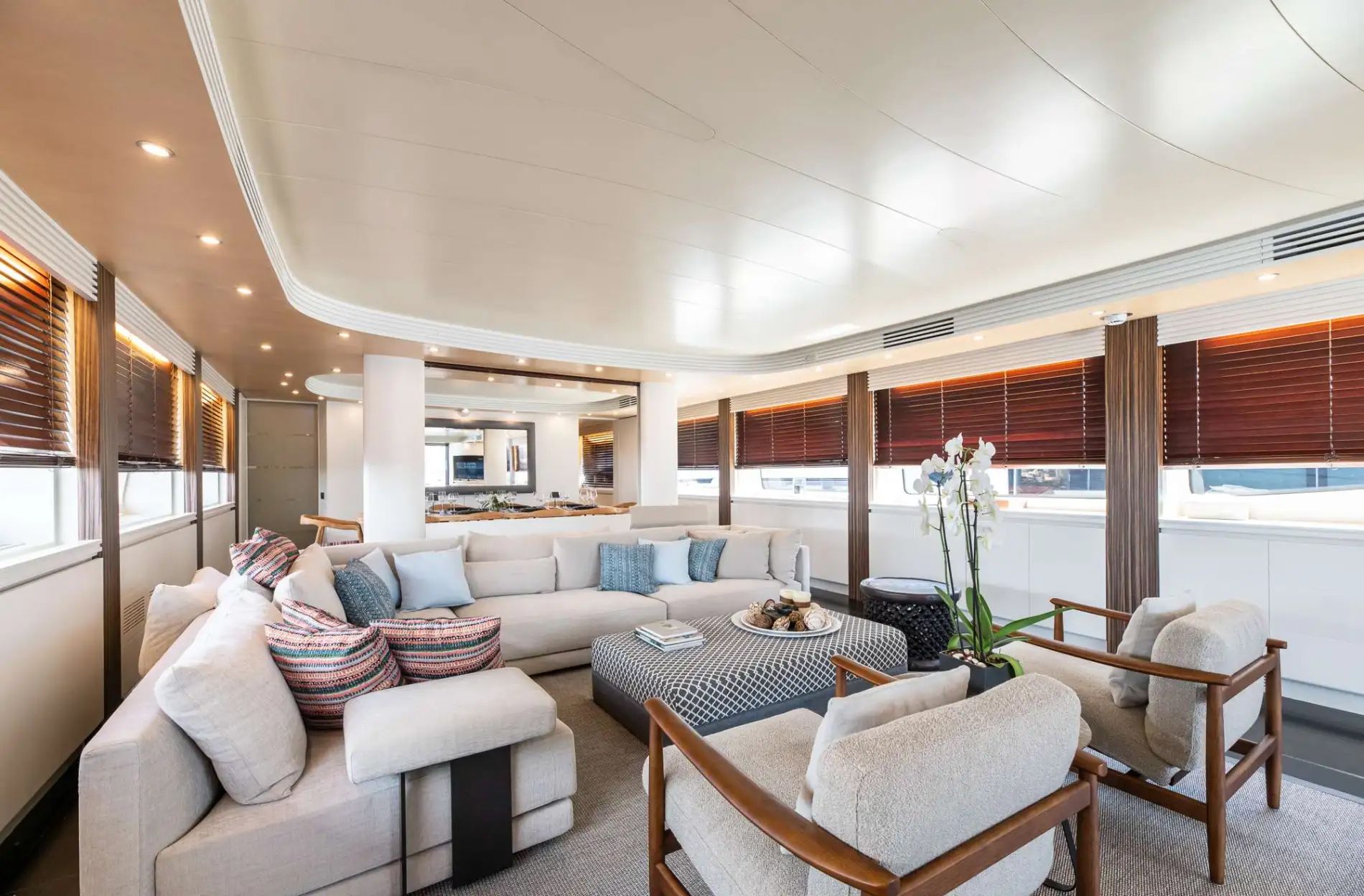 She presents guests with a choice of exterior deck spaces including a beautiful flybridge with contemporary dining setting and lounge with neutral l-shaped sofa and coffee table; aft sundeck jacuzzi surrounded by comfortable sun ...
