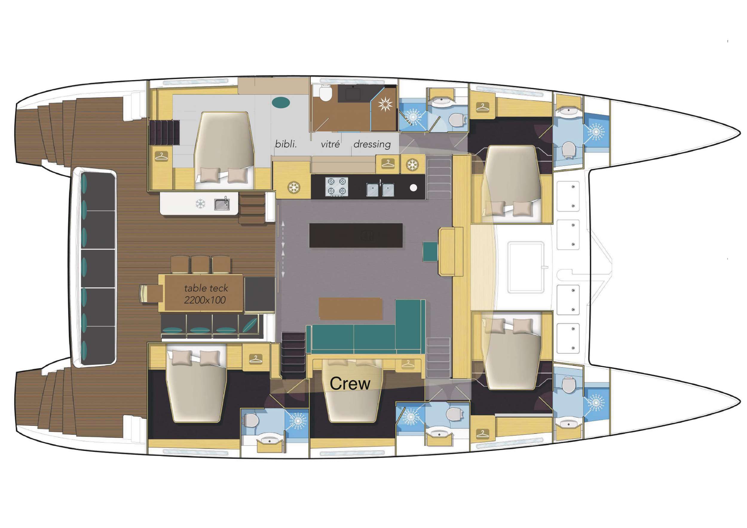 The guest cabins are located on the lower decks.