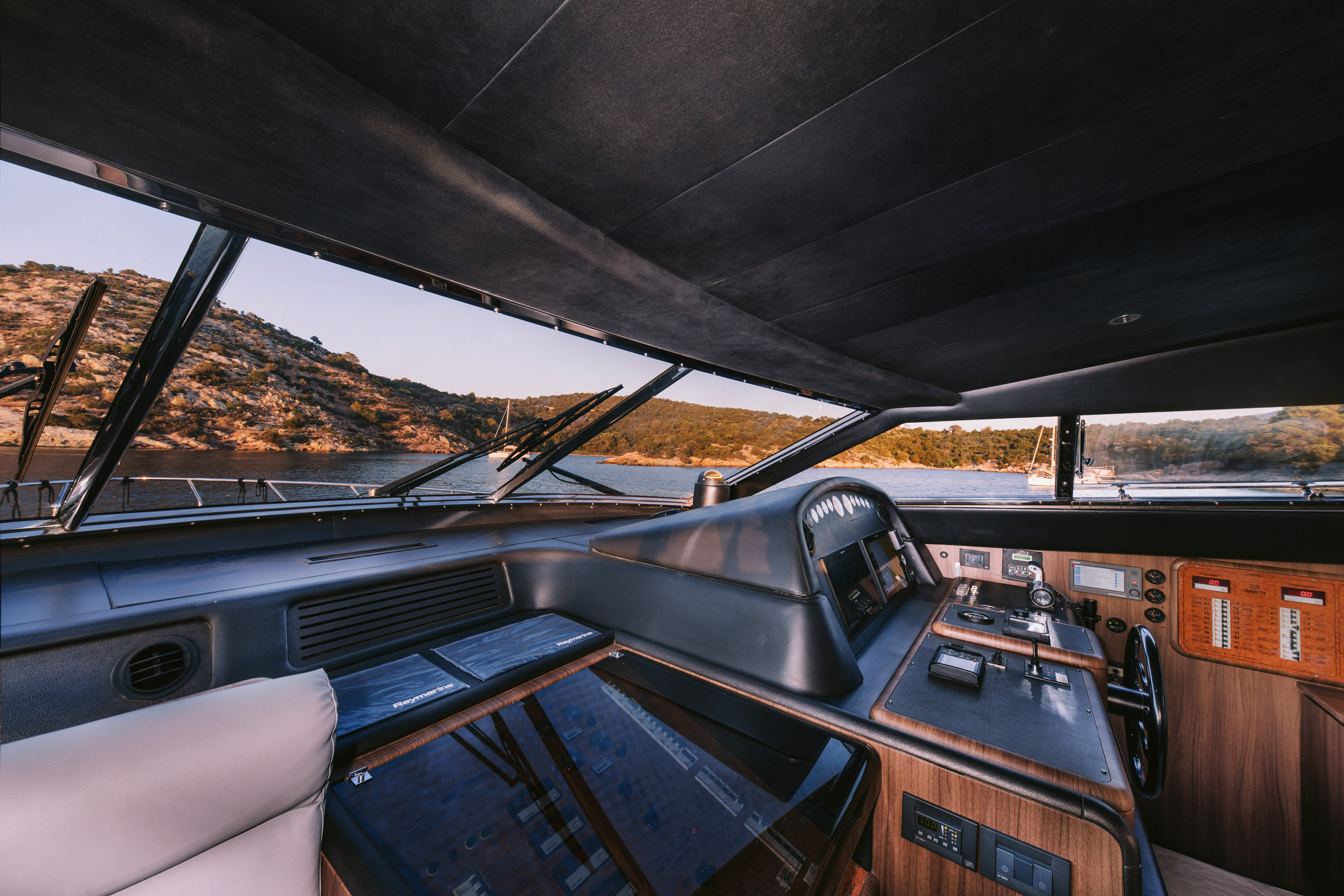The flybridge is accessed by a port stairway from the main deck aft, and opposite there is an L-shaped corner sofa and a jet ski stored along the stern.