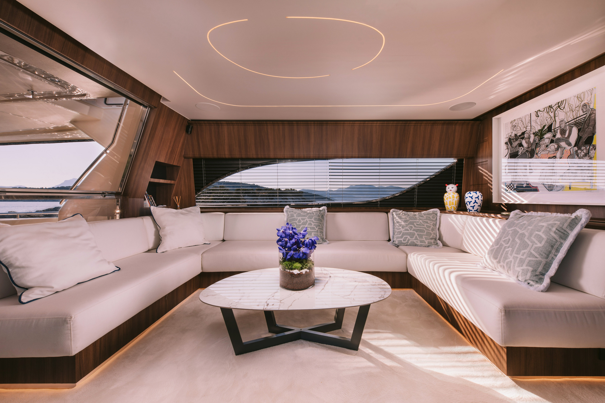 A set of steps leads down into the aft salon, where a C-shaped sofa surrounds a coffee table on the port side and two armchairs, and a widescreen TV is to starboard. Glass sliding doors open the space up onto the main deck aft ...