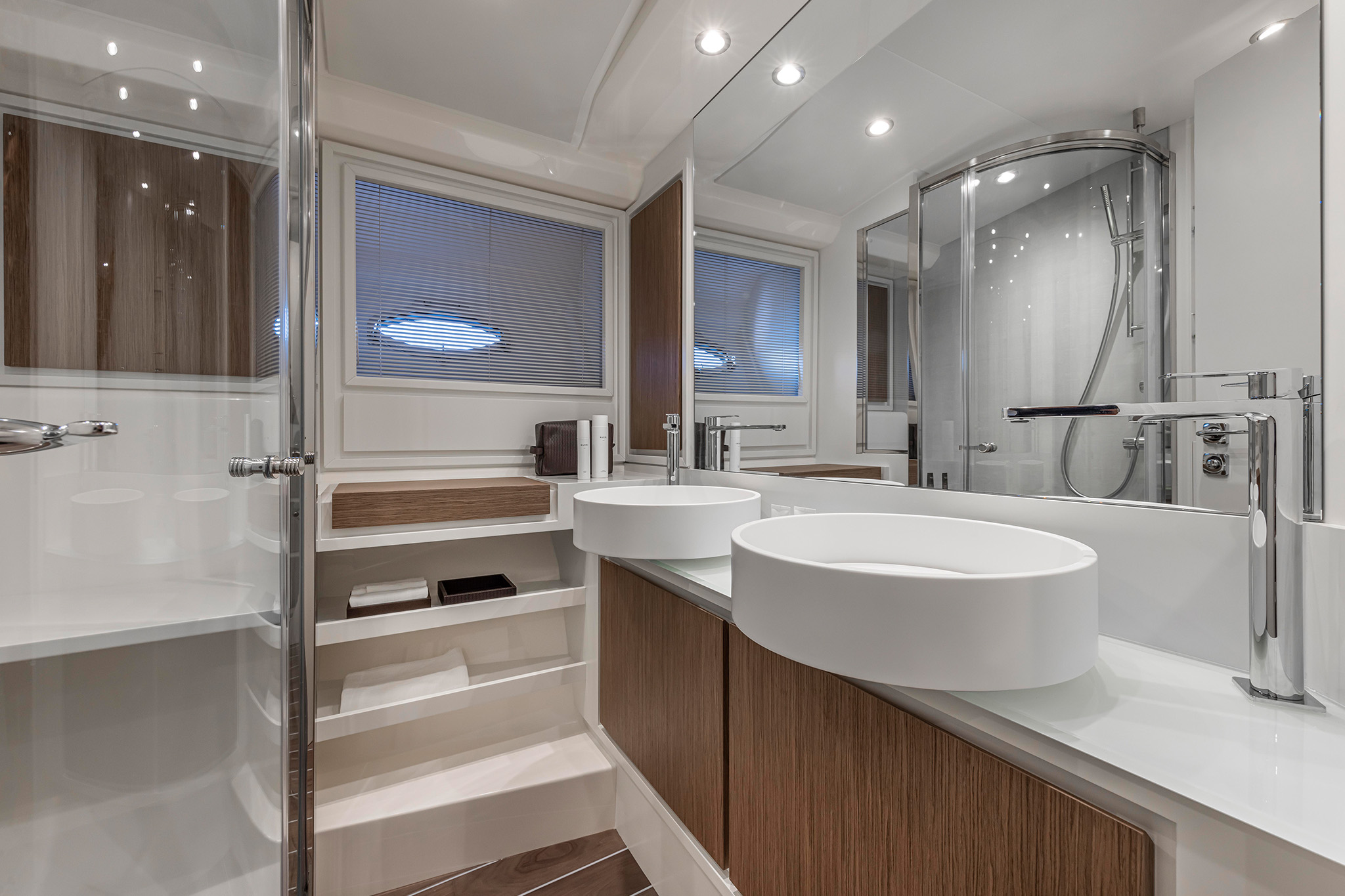The VIP cabin is to starboard aft of the communal area and features a double bed and bright contemporary bathroom. There is an additional twin cabin to port which is kept for crew use.