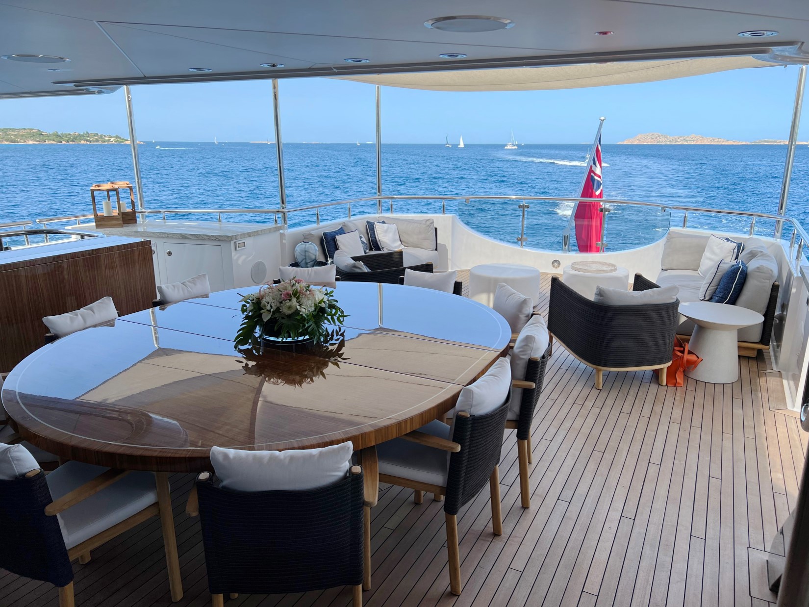 The bridge deck aft is the ideal location for guests to savour an al fresco meal and then leisurely enjoy a coffee or nightcap in the lounge space with open views. The dining area offers the same comfort as the sun deck with glass doors which can enclose the space in less favourable weather.