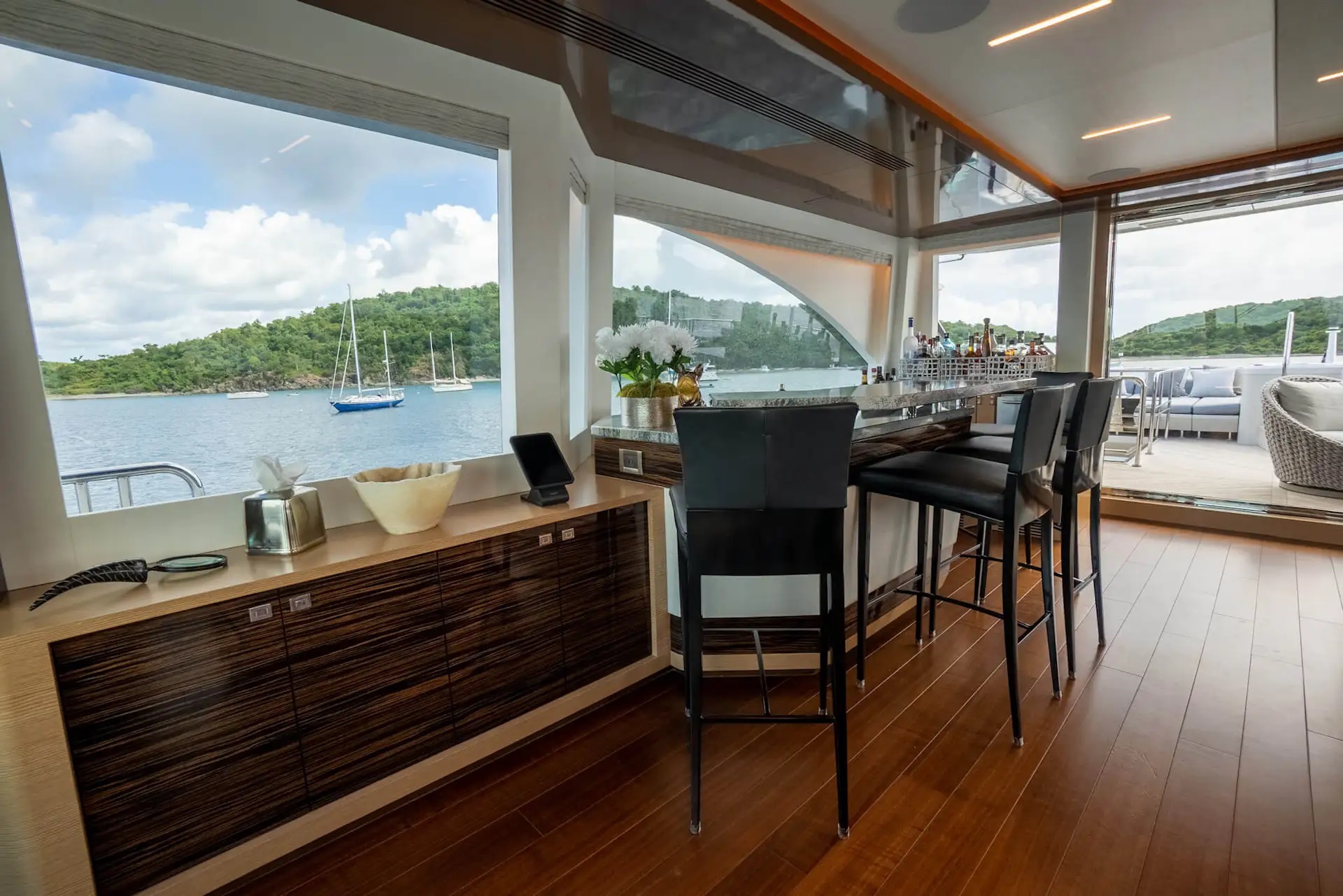 When the garage door is opened, a tranquil lounge area is revealed with a sitting area, a bar and plenty of shade. The swim hydraulic platform extends into the water allowing seamless access to the exciting selection of water toys.