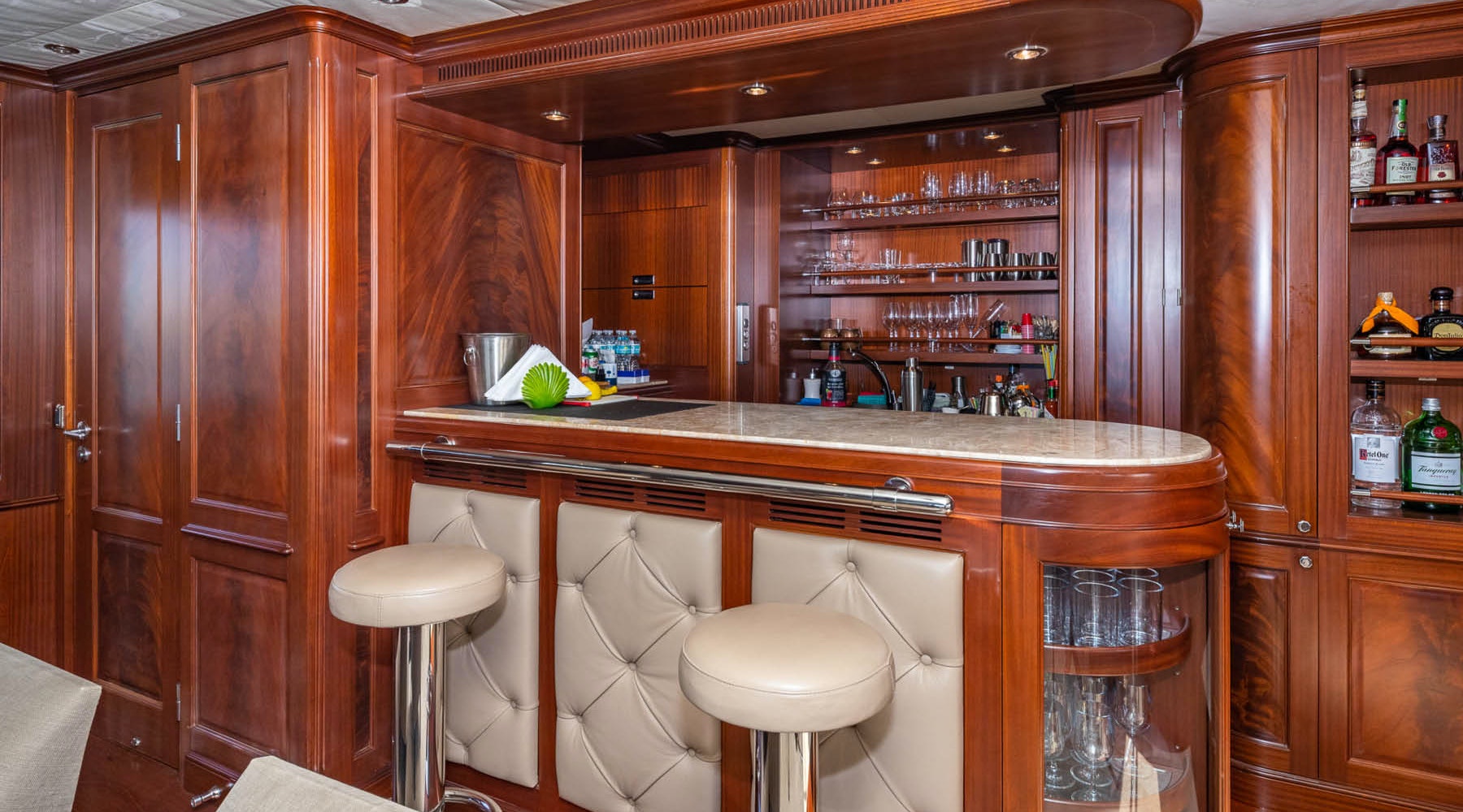 The upper deck aft has a bar forward to port, a large circular dining table to seat 10, and a ...