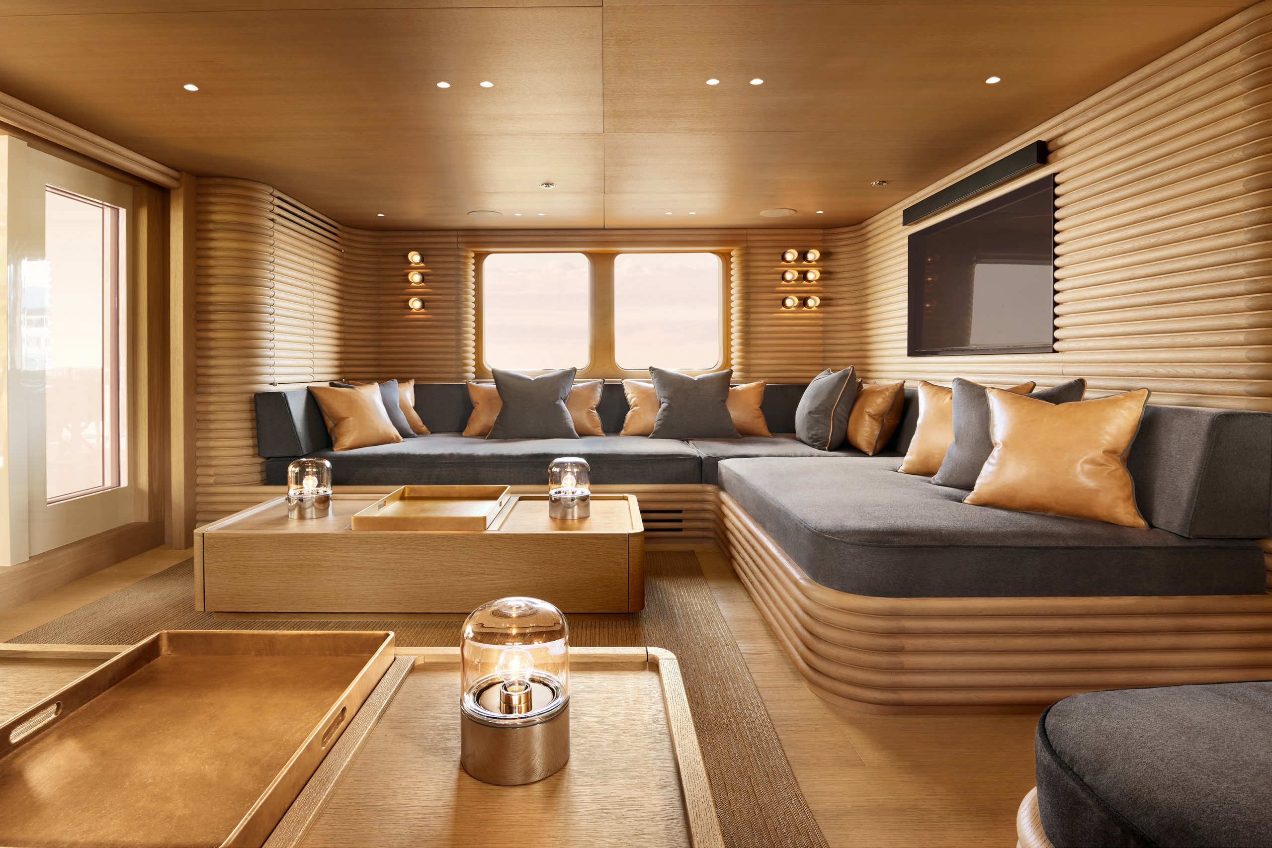 On the main deck, the salon and dining are open plan, offering the lounge aft and dining forward. With large windows surrounding the salon, as well as aft-facing windows and doors, the space is light and airy.