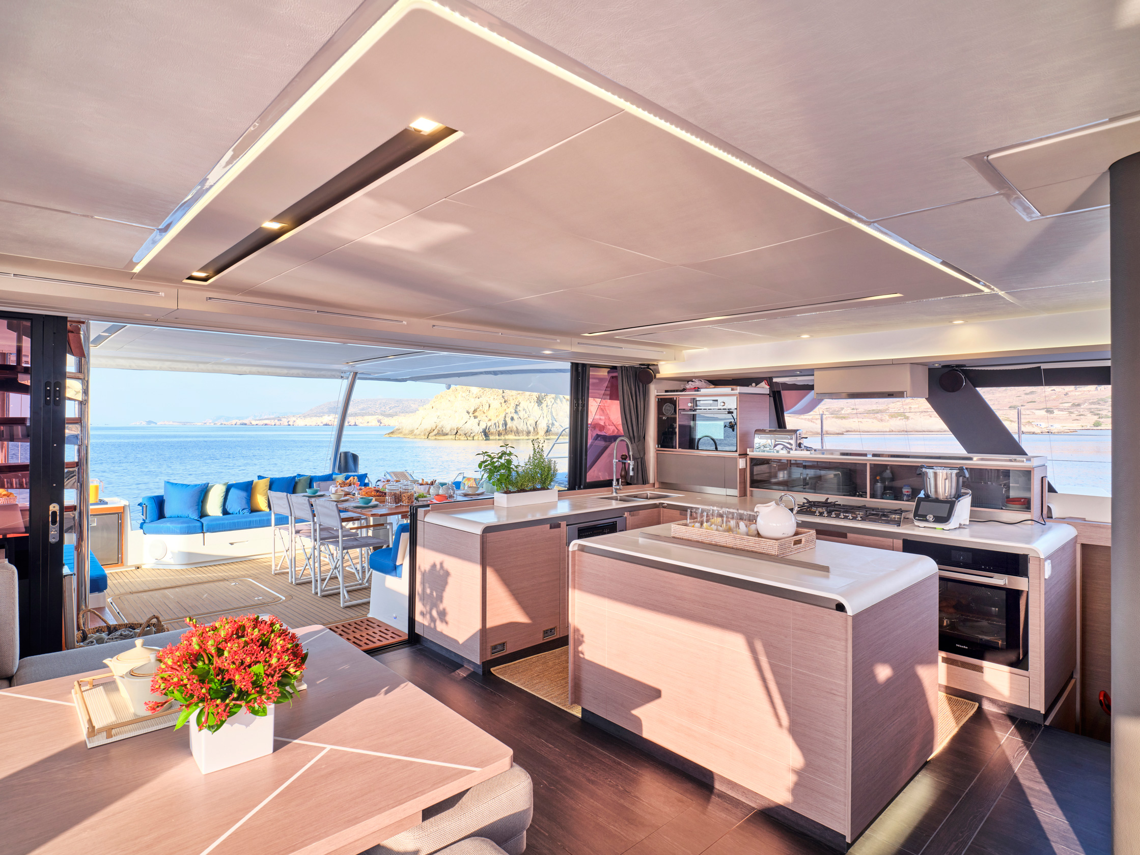 The galley is integrated into the main salon where guests can savour a tasty meal from the chef while sitting at the starboard side L-shaped sofa and table in dining mode. Or put their feet up and enjoy a mid-morning coffee with the table set lower.