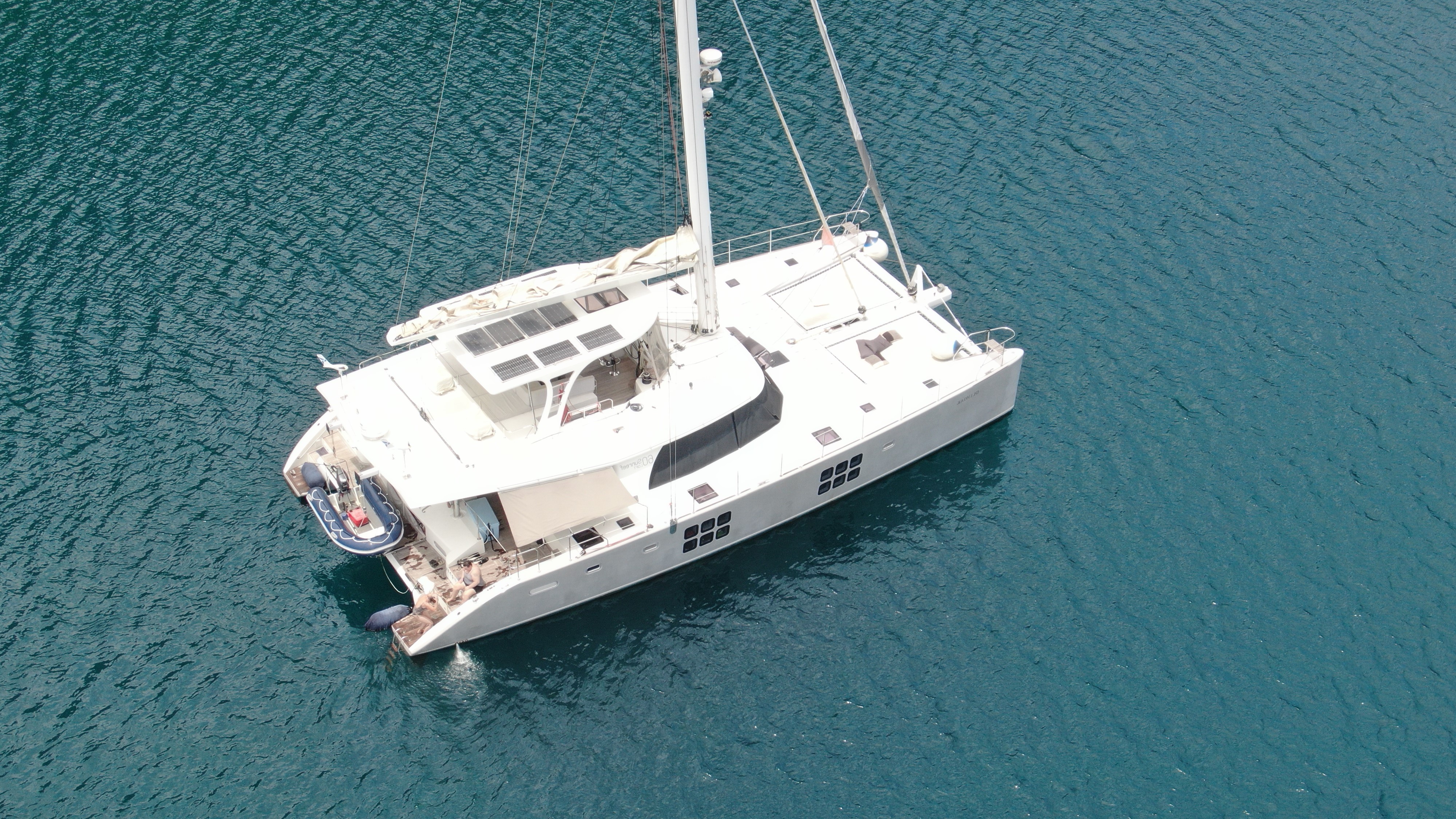 Additionally, the flybridge, with a fixed bimini, offers sun pads for soaking up the sun or joining in the sailing.