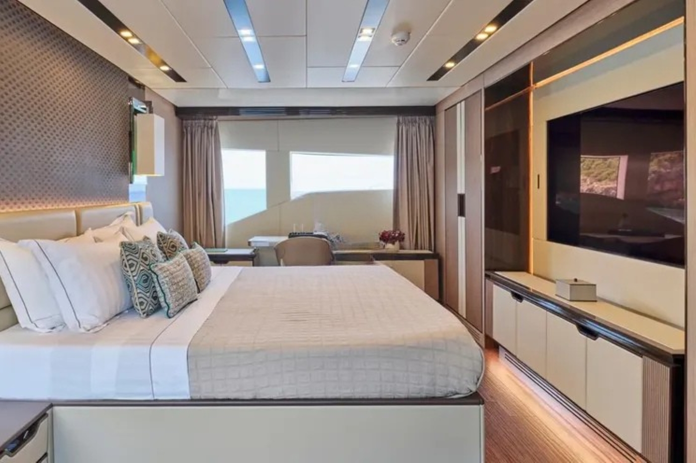 The Master Stateroom, forward on the main deck, has been designed to enjoy a spectacular sea view even when in bed, and is equipped with a luxurious bathroom with double sink.