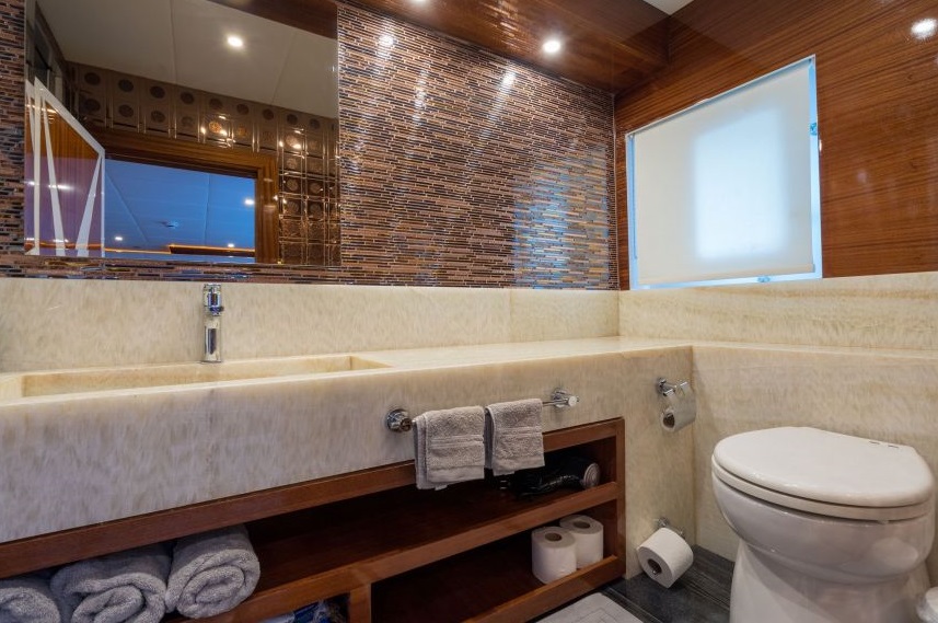 Each cabin benefits from the luxury and privacy of ensuite bathroom facilities finished in marble, tile and wood. The suites are configured as 1 master, 3 doubles and 1 twin. Tenders & Toys