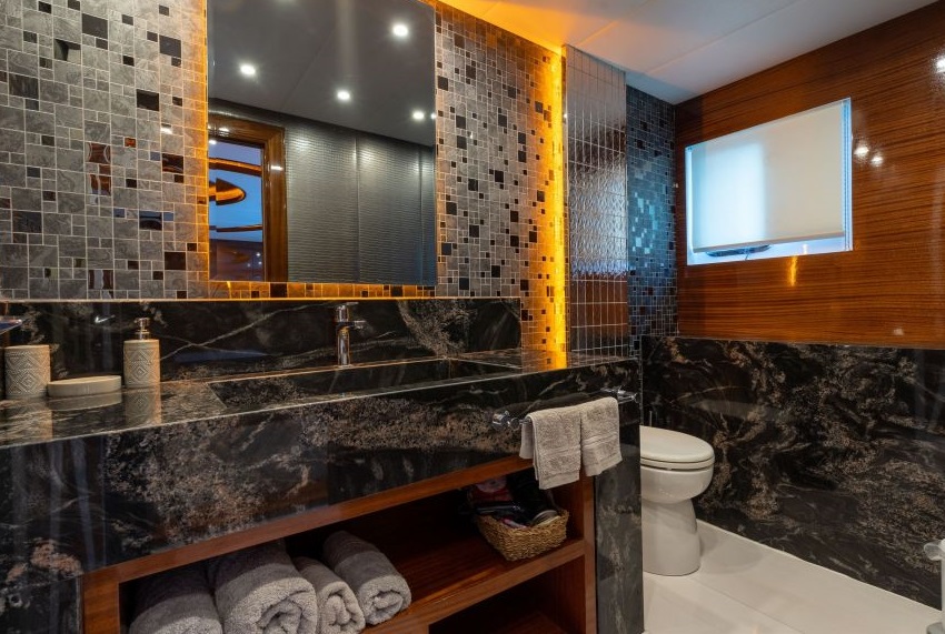 Each cabin benefits from the luxury and privacy of ensuite bathroom facilities finished in marble, tile and wood. The suites are configured as 1 master, 3 doubles and 1 twin. Tenders & Toys