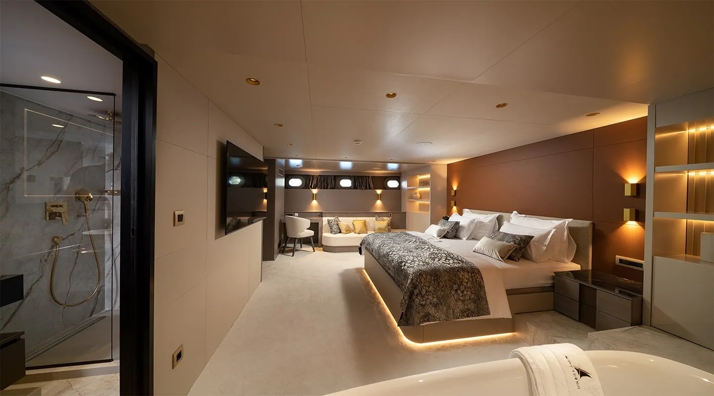 She can accommodate 12 guests in six bright and contemporary suites. Eight professional crew will be on board to enhance the charter experience.
