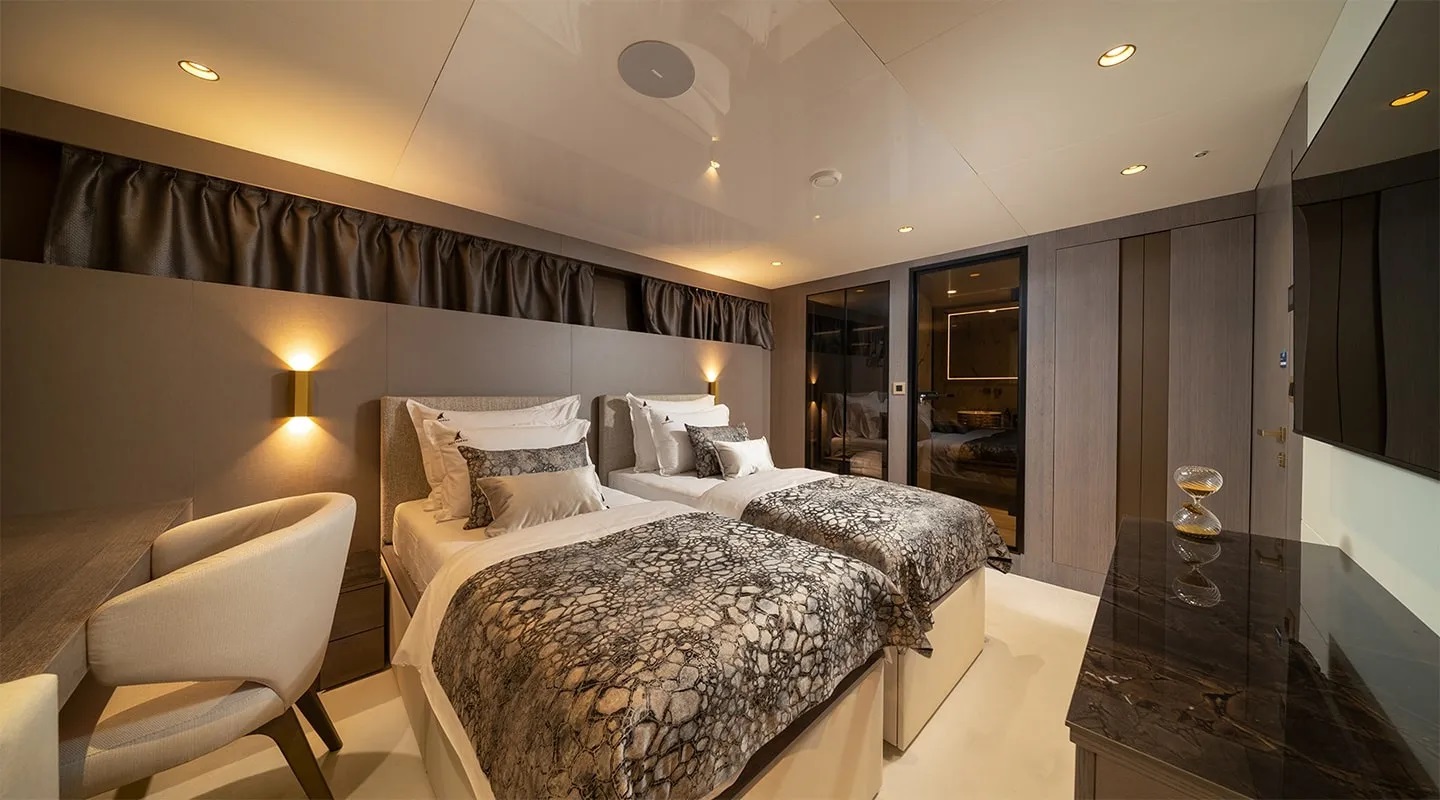 She can accommodate 12 guests in six bright and contemporary suites. Eight professional crew will be on board to enhance the charter experience.