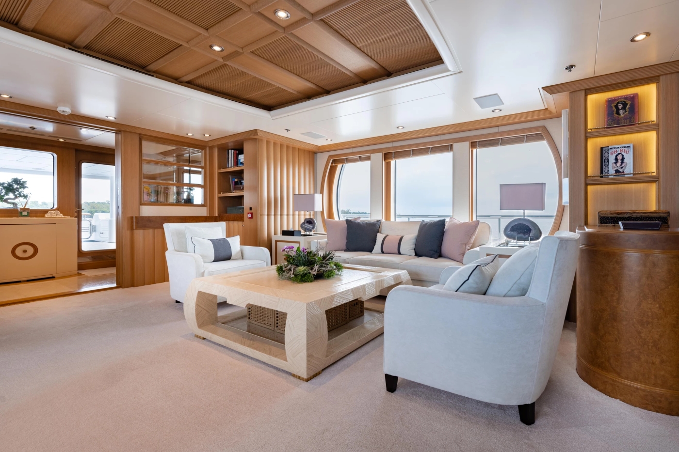 The formal dining area and main salon combine into one large entertainment area to the aft, and the forward formal dining area seats up to 12 guests surrounded by large windows and unique art work.