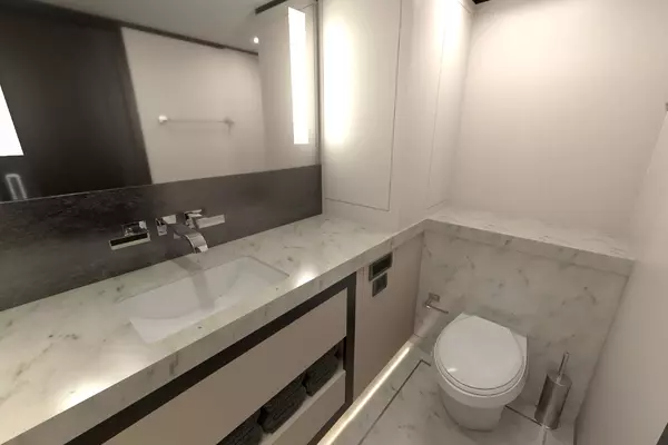 The full beam main deck master is a tranquil haven for primary charter guests with large windows, an aft facing bed, lounge area and forward ensuite bathroom.