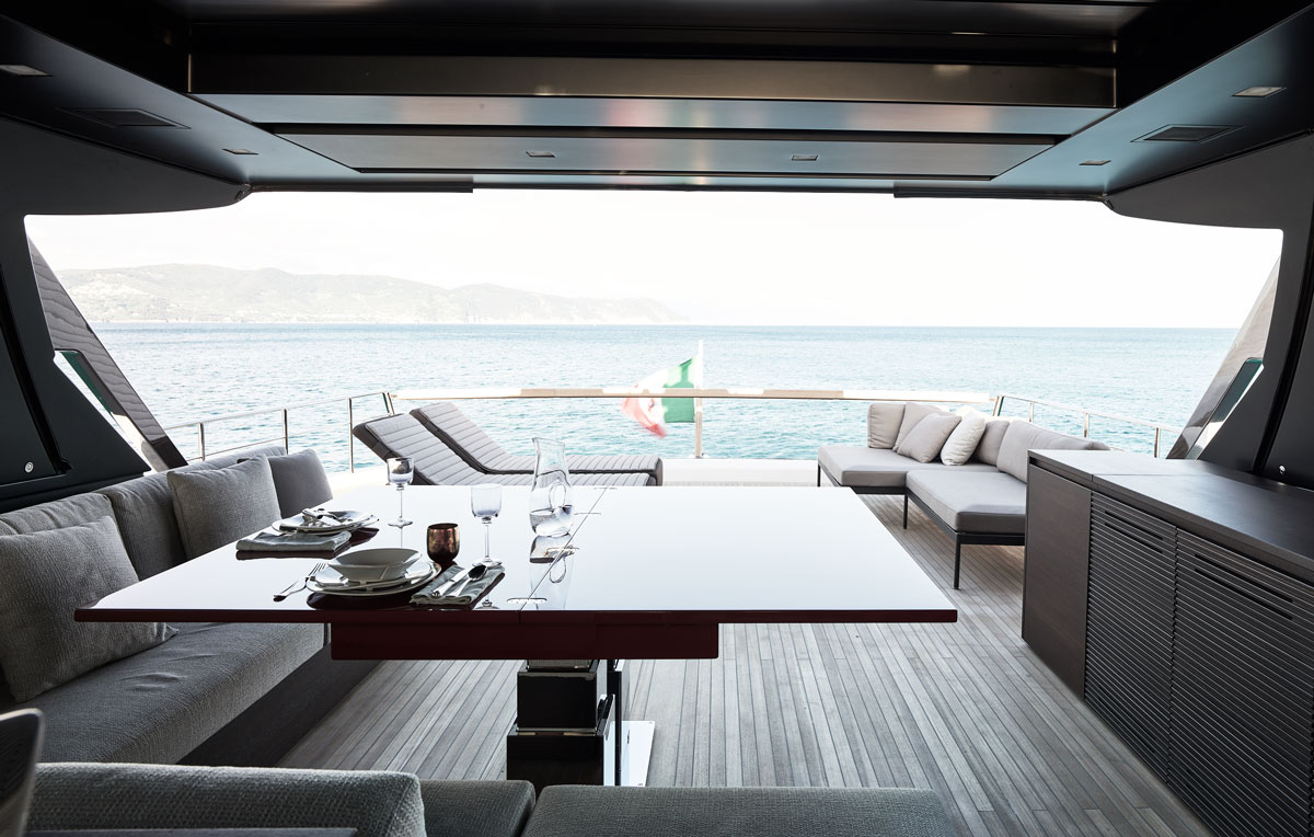 The flybridge is a sociable space which unites the semi-open sky lounge with the outdoor deck space.