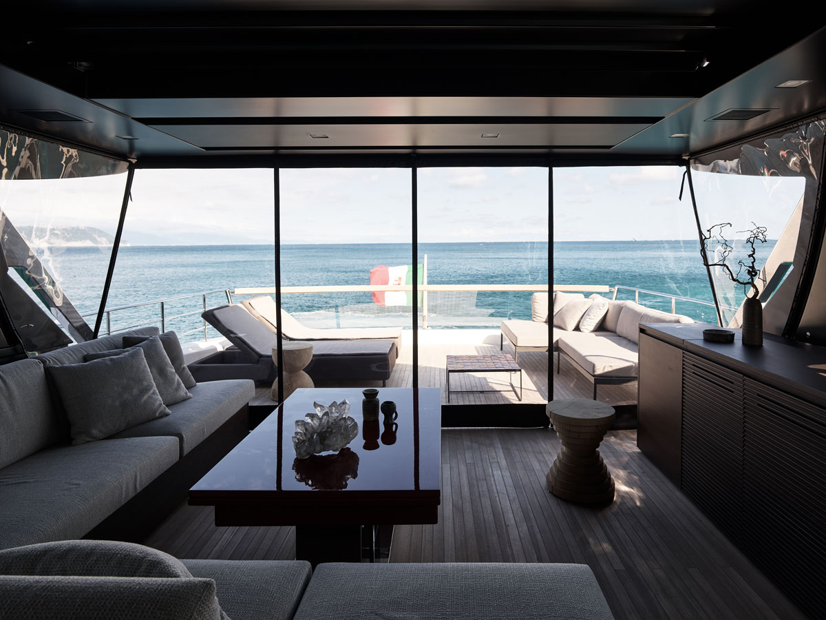 The flybridge is a sociable space which unites the semi-open sky lounge with the outdoor deck space.