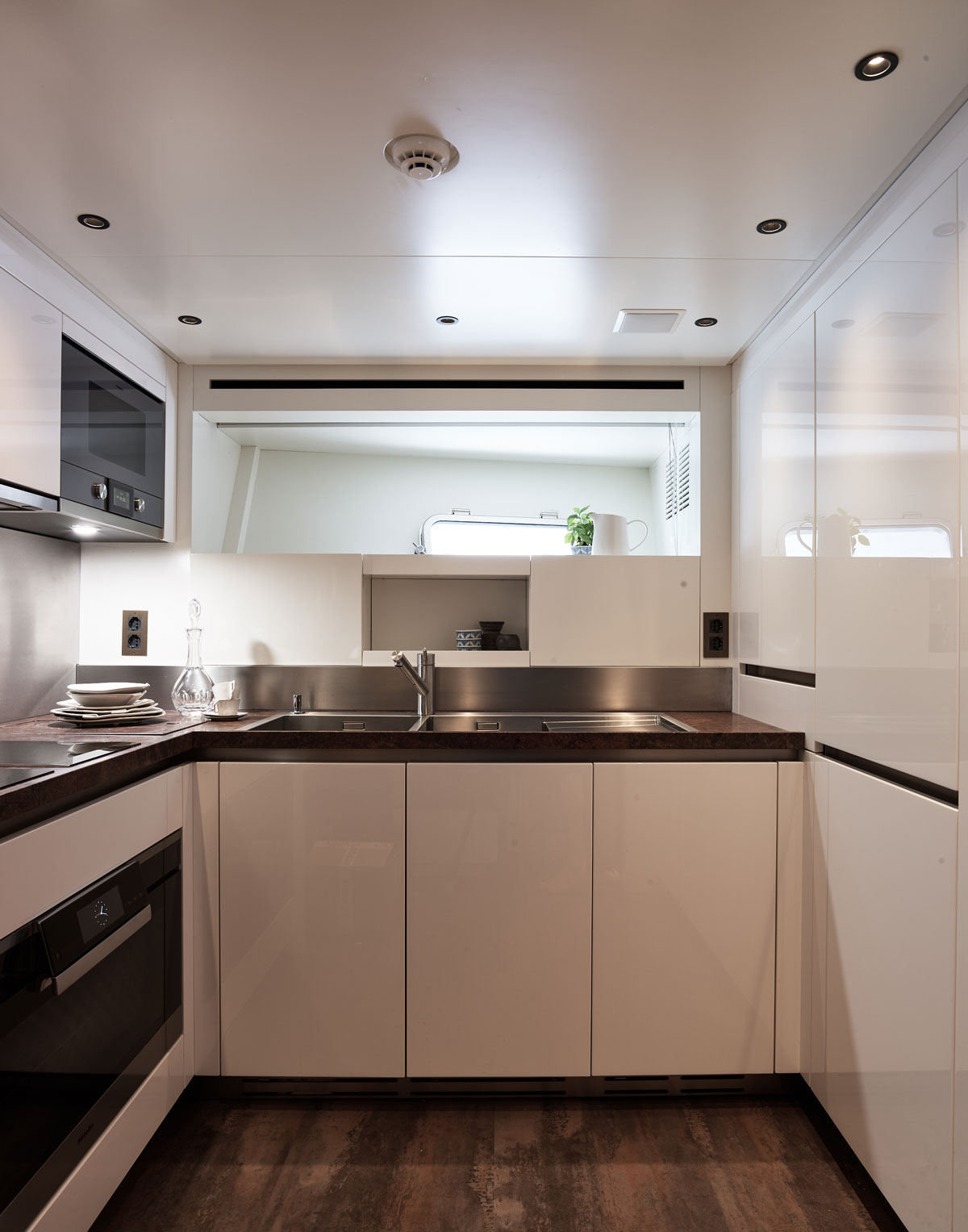 The flybridge is a sociable space which unites the semi-open sky lounge with the outdoor deck space.