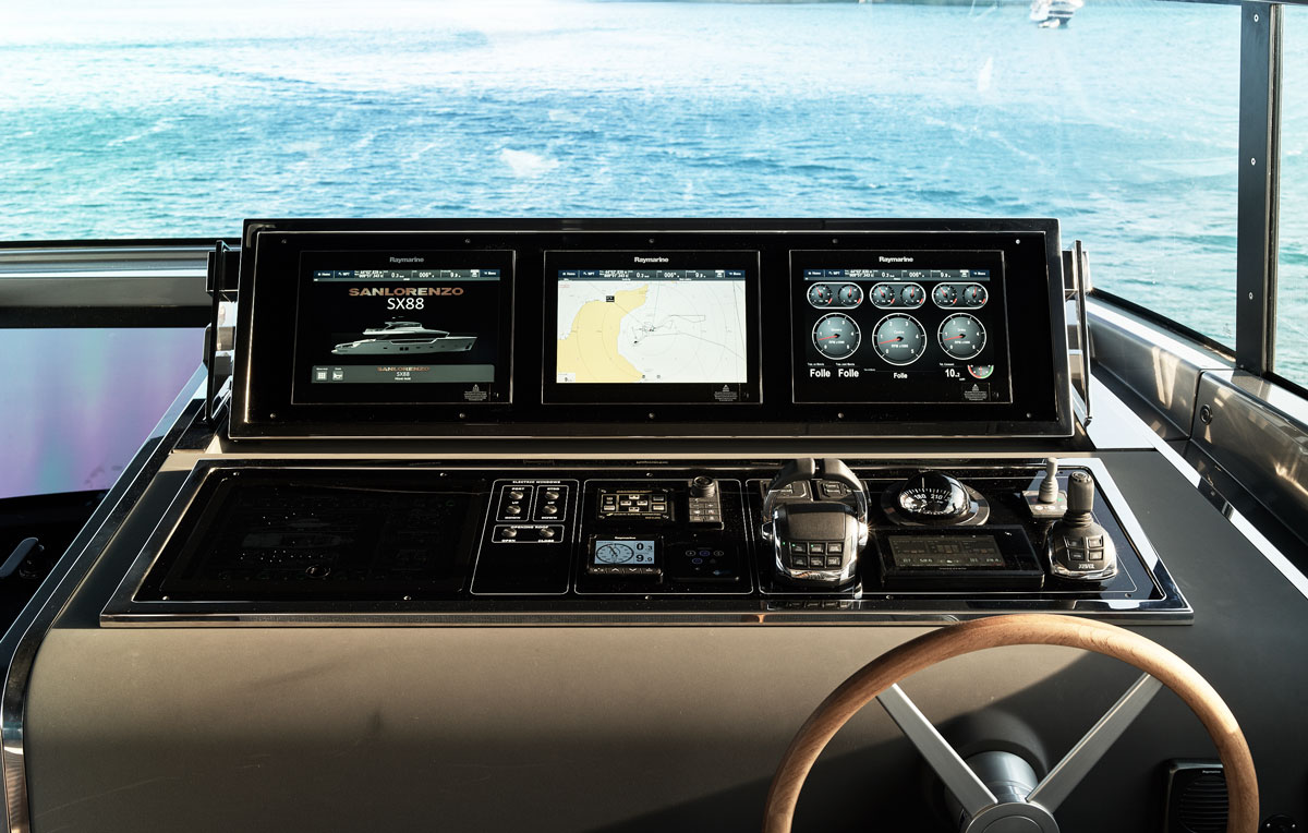 The flybridge is a sociable space which unites the semi-open sky lounge with the outdoor deck space.