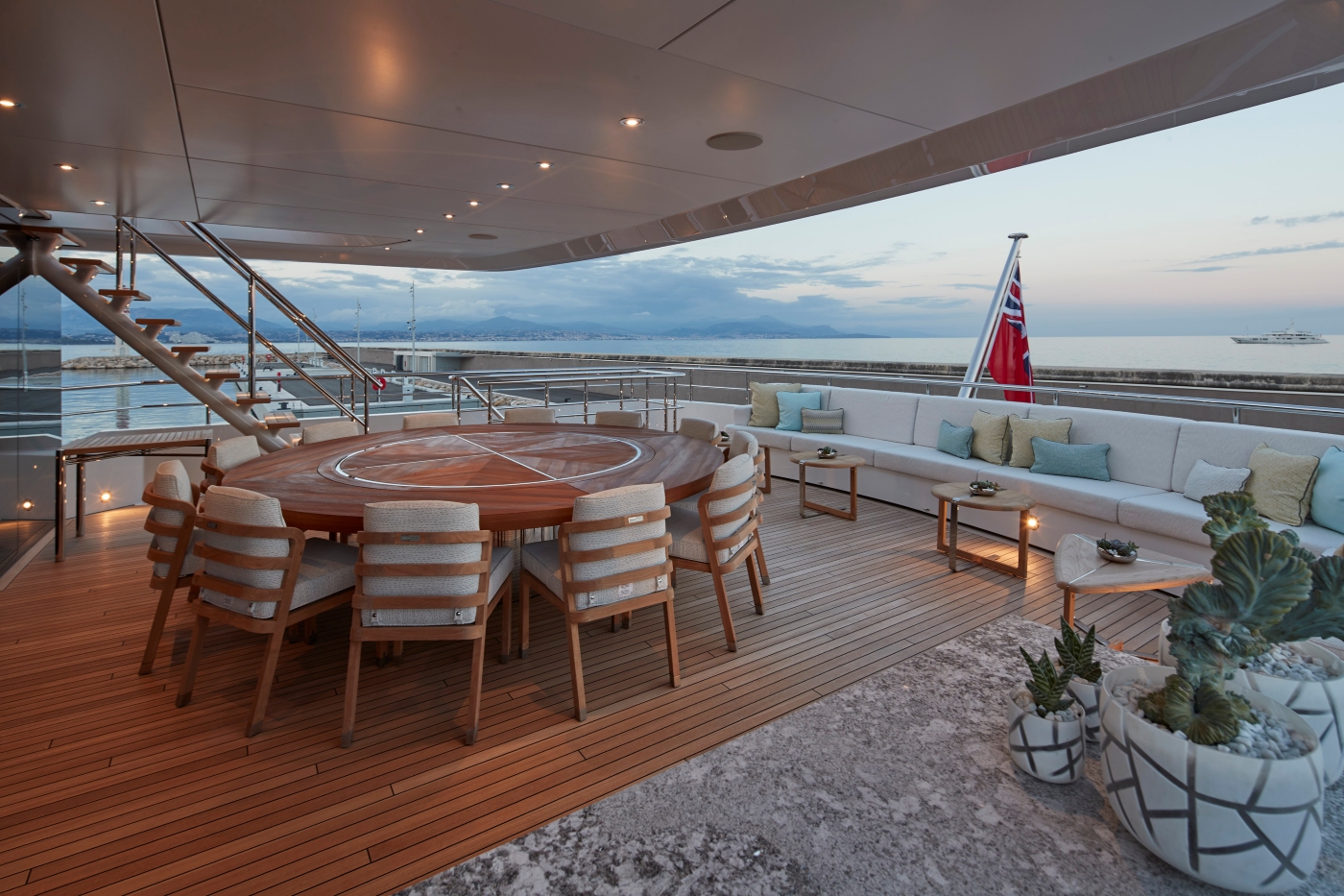 The sun deck is a perfect sociable space with sun beds, a huge dining table, a full bar with a selection of stools and a wonderful deck jacuzzi.