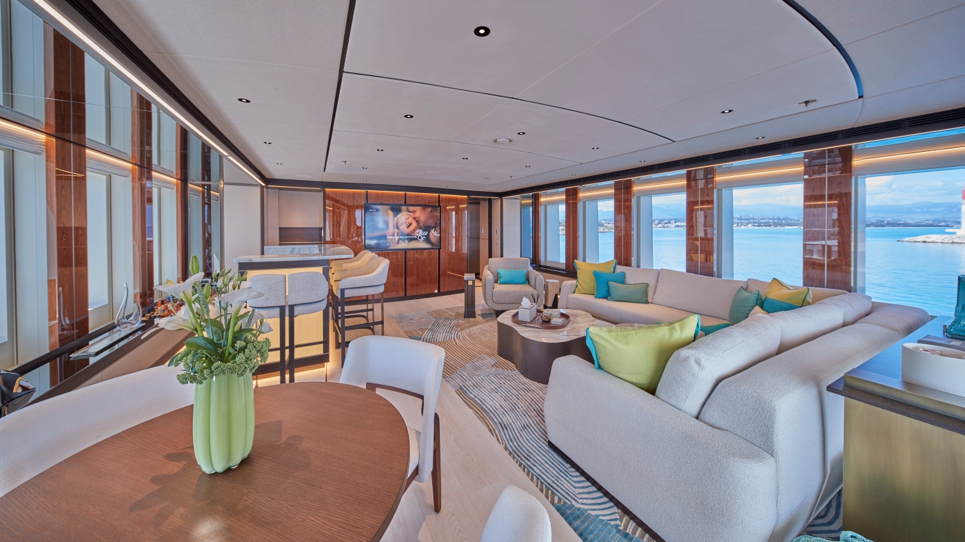 The vast main salon offers a lounge with a selection of stylish and comfortable sofas aft and a 12-seater dining table forward. Further forward on this deck is the owner’s apartment.