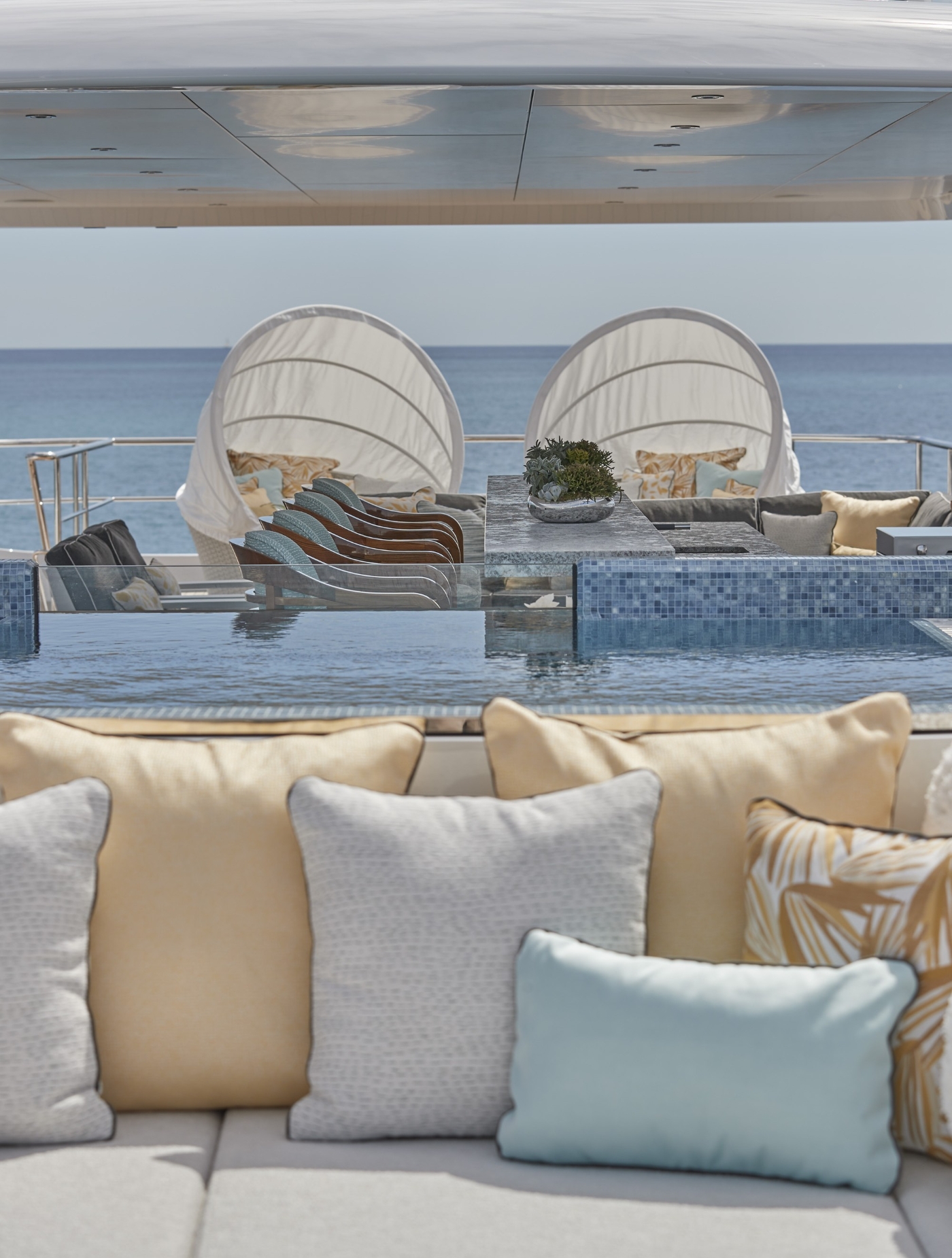The sun deck is a perfect sociable space with sun beds, a huge dining table, a full bar with a selection of stools and a wonderful deck jacuzzi.