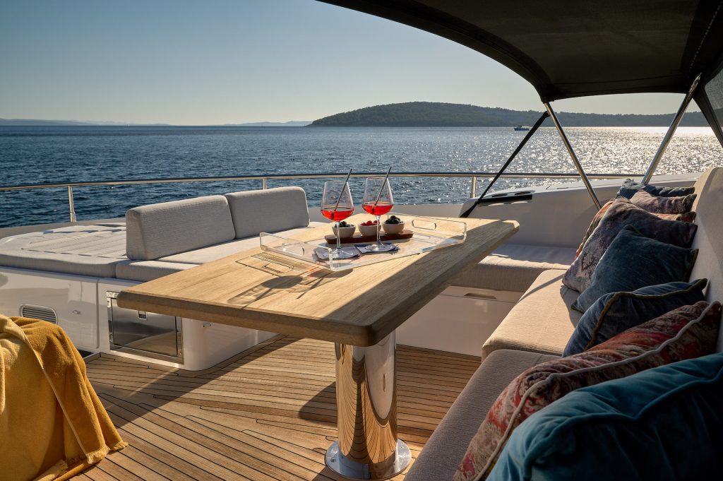 NOTABLE FEATURES OF HIDEAWAY I: ~Sociable flybridge ~360-degree views courtesy of the open superstructure design ~Contemporary interior ~Water toys on board ~Air conditioning ~WiFi