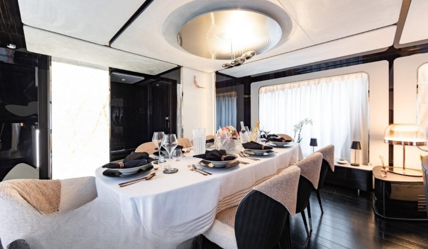 The space offers a sheltered dining setting, a forward helm station and an aft lounge and bar area. The main deck aft creates a lovely balcony space overlooking the swim platform which boasts a wide aft-facing sofa and full beam platform with steps into the sea.
