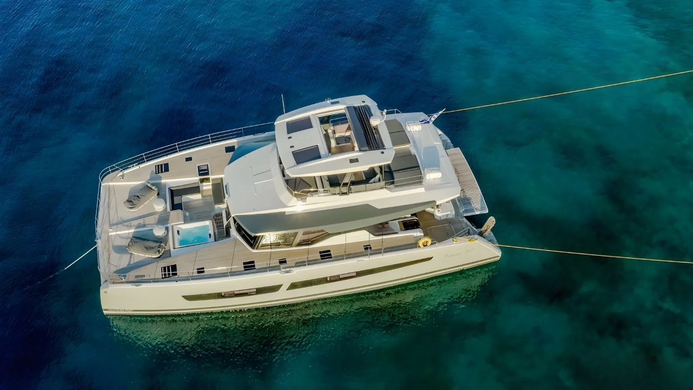 The space is divided into a dining area with flexible table and cosy lounge with a pantry and helm station. Full-width aft doors create seamless indoor/outdoor flow, while a forward door leads to the foredeck lounge.