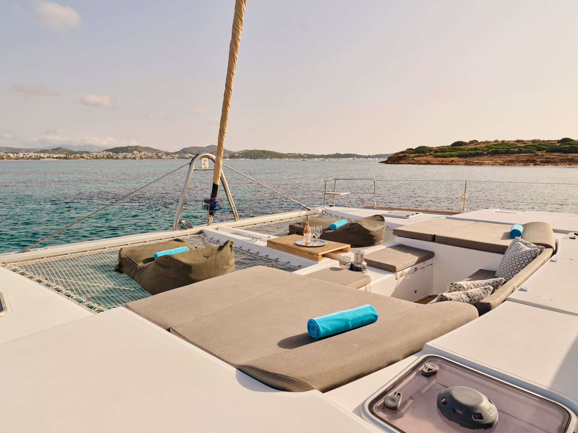 The foredeck is home to a generous selection of sun pads on either side and on the forward trampolines, surrounding a cosy sunken lounge.