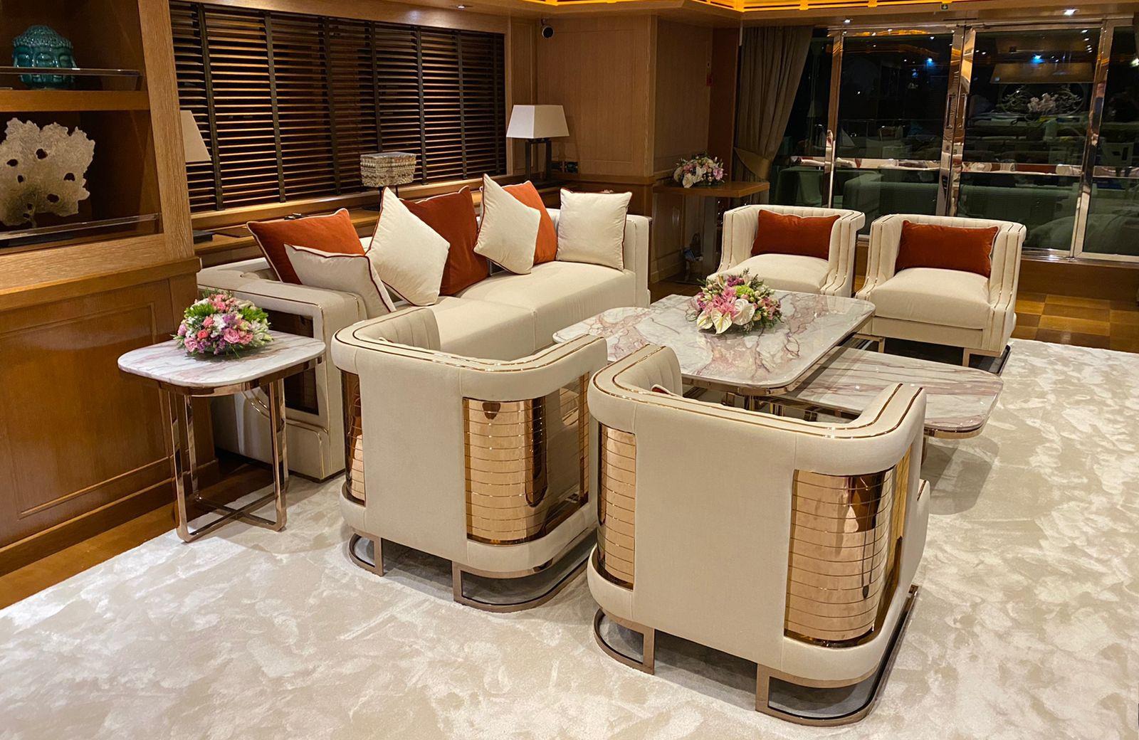 Interior spaces include an impressive upper deck sky lounge with a bar and games table and gorgeous formal main salon including a lounge aft and a forward dining room.