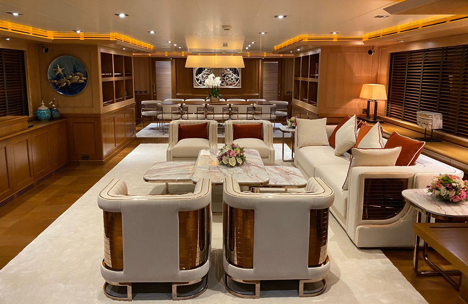 Interior spaces include an impressive upper deck sky lounge with a bar and games table and gorgeous formal main salon including a lounge aft and a forward dining room.