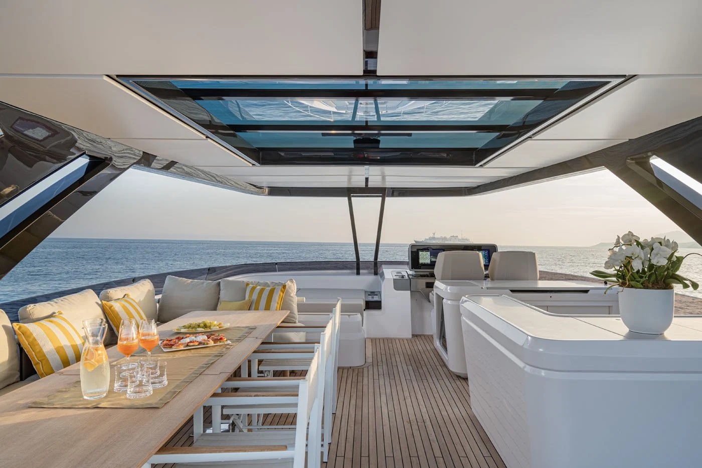 Aft finds two contemporary sun loungers open to the full sun. Forward is an on-deck helm station with adjacent bench seating so guests can chat to the captain in comfort.