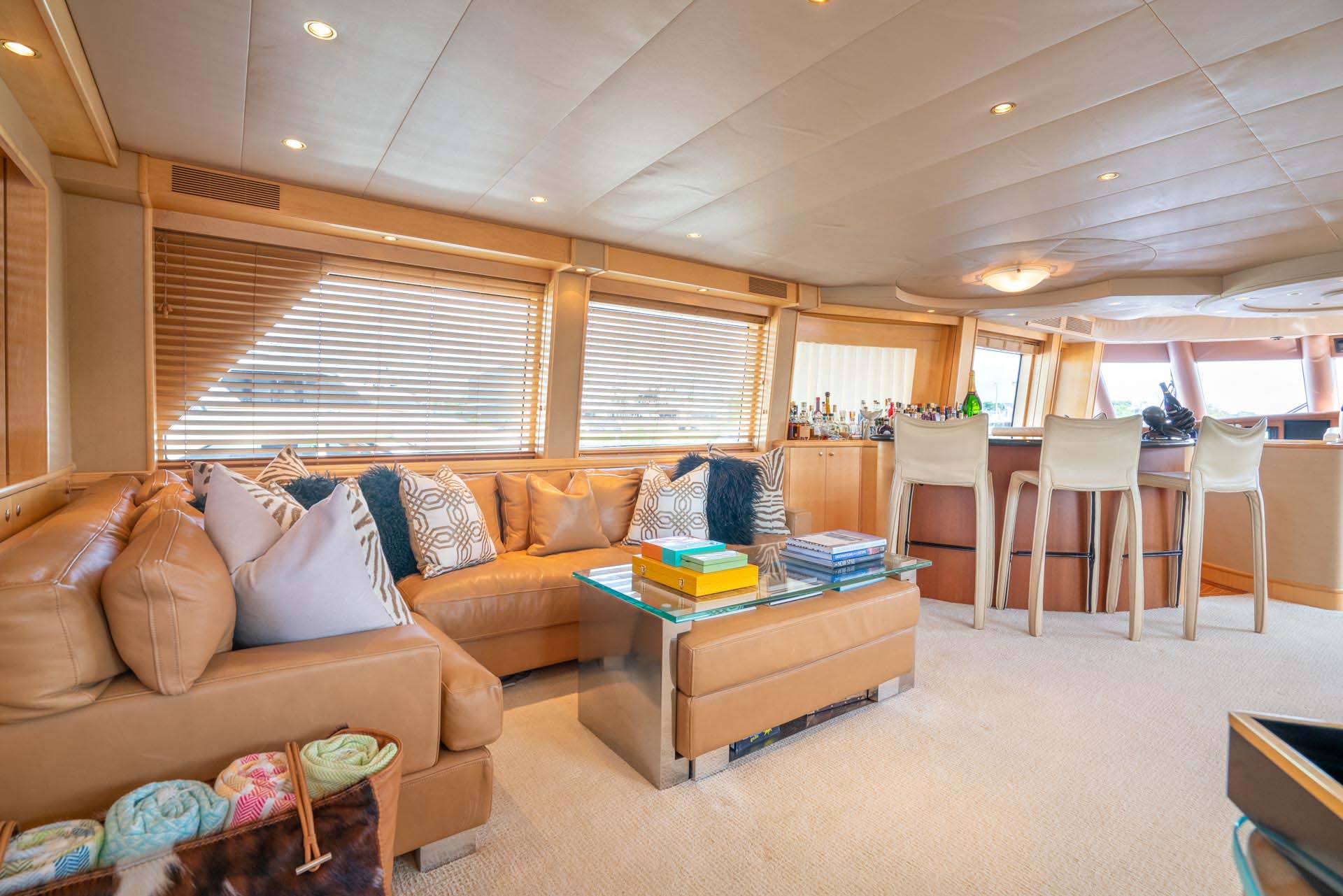 The climate-controlled main deck aft is fitted with a rectangular table that is surrounded by chairs and a settee with seating for up to 10 guests.