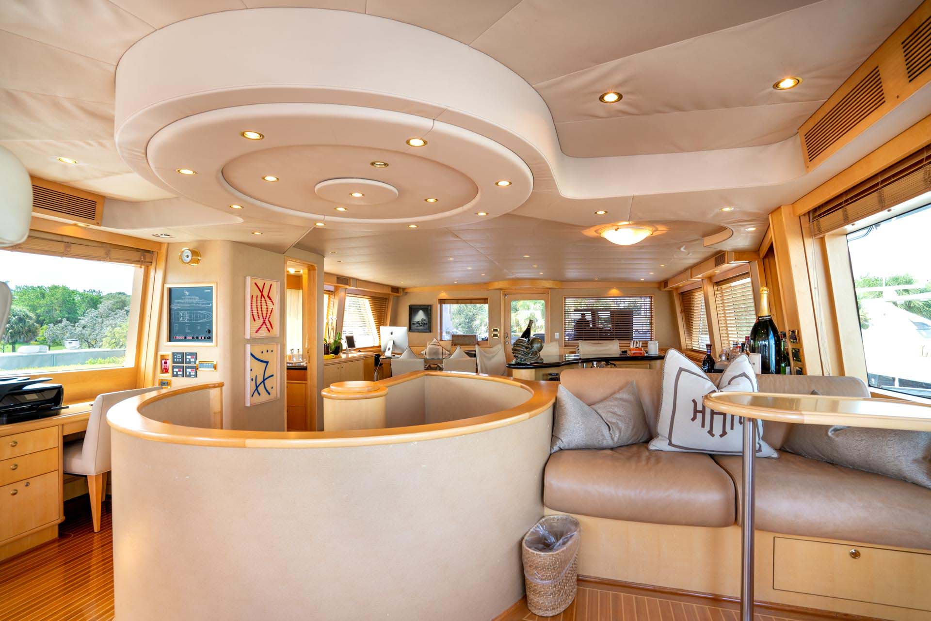 The climate-controlled main deck aft is fitted with a rectangular table that is surrounded by chairs and a settee with seating for up to 10 guests.