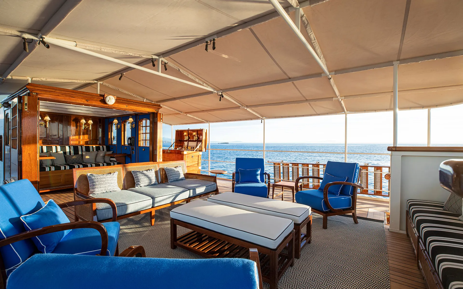 The main deck aft is dedicated to al fresco dining and features a 12-seater table sheltered by the sun deck overhang and lit at night by a fabulous art deco deck chandelier.
