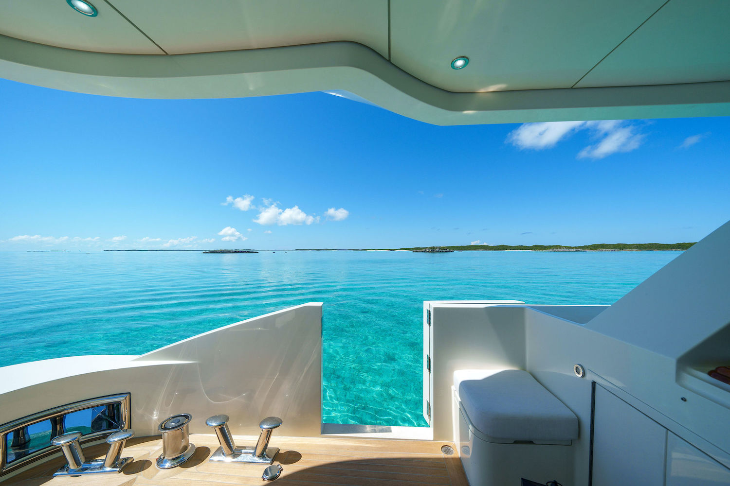 The main bridge is on the upper level and accessed from the flybridge, allowing the forward main deck area for the master suite and galley. The additional guest accommodation is on the lower deck.