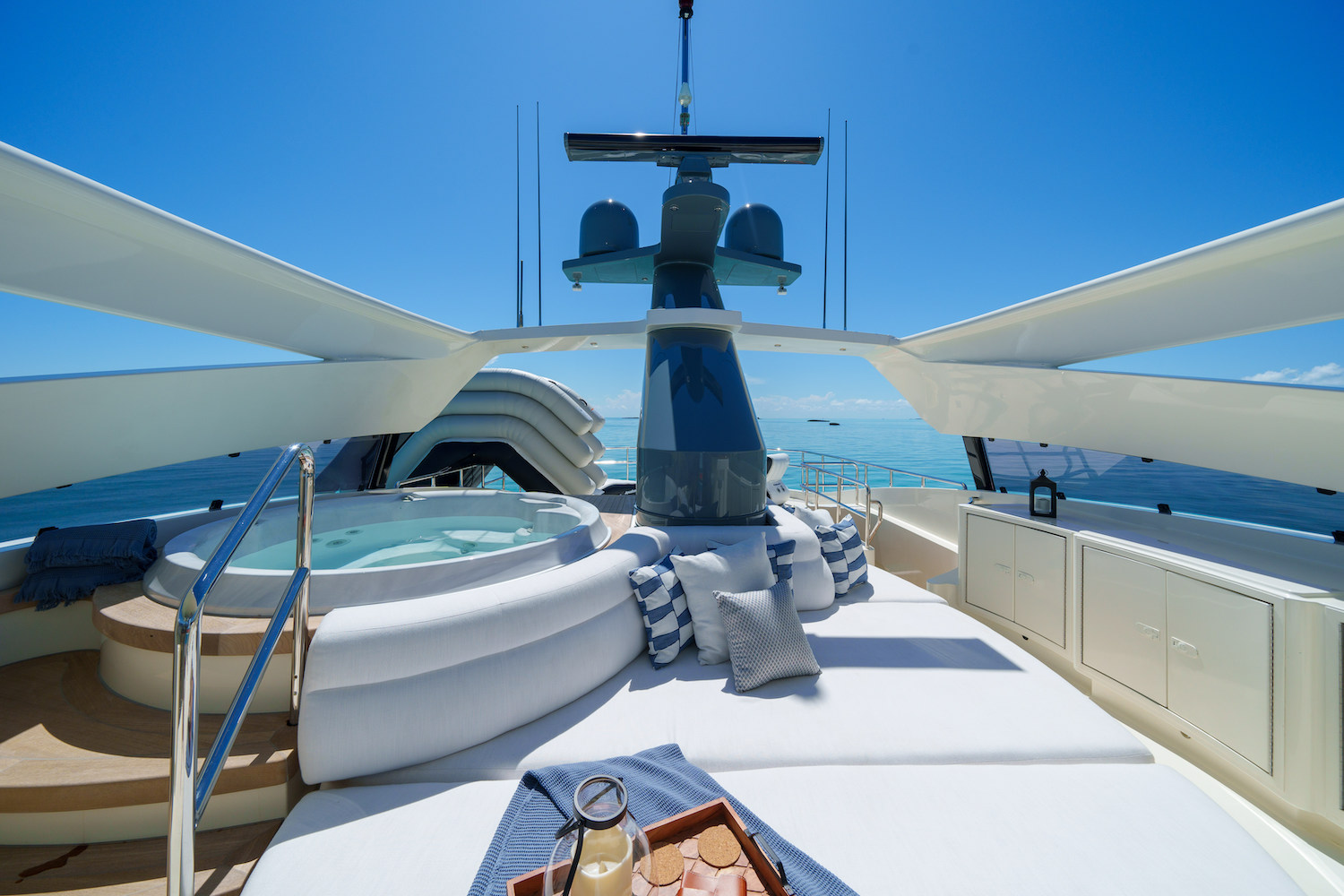 Guests will be delighted to spend time on the open flybridge sun deck with her circular jacuzzi, curved bar and 8-seater dining table.