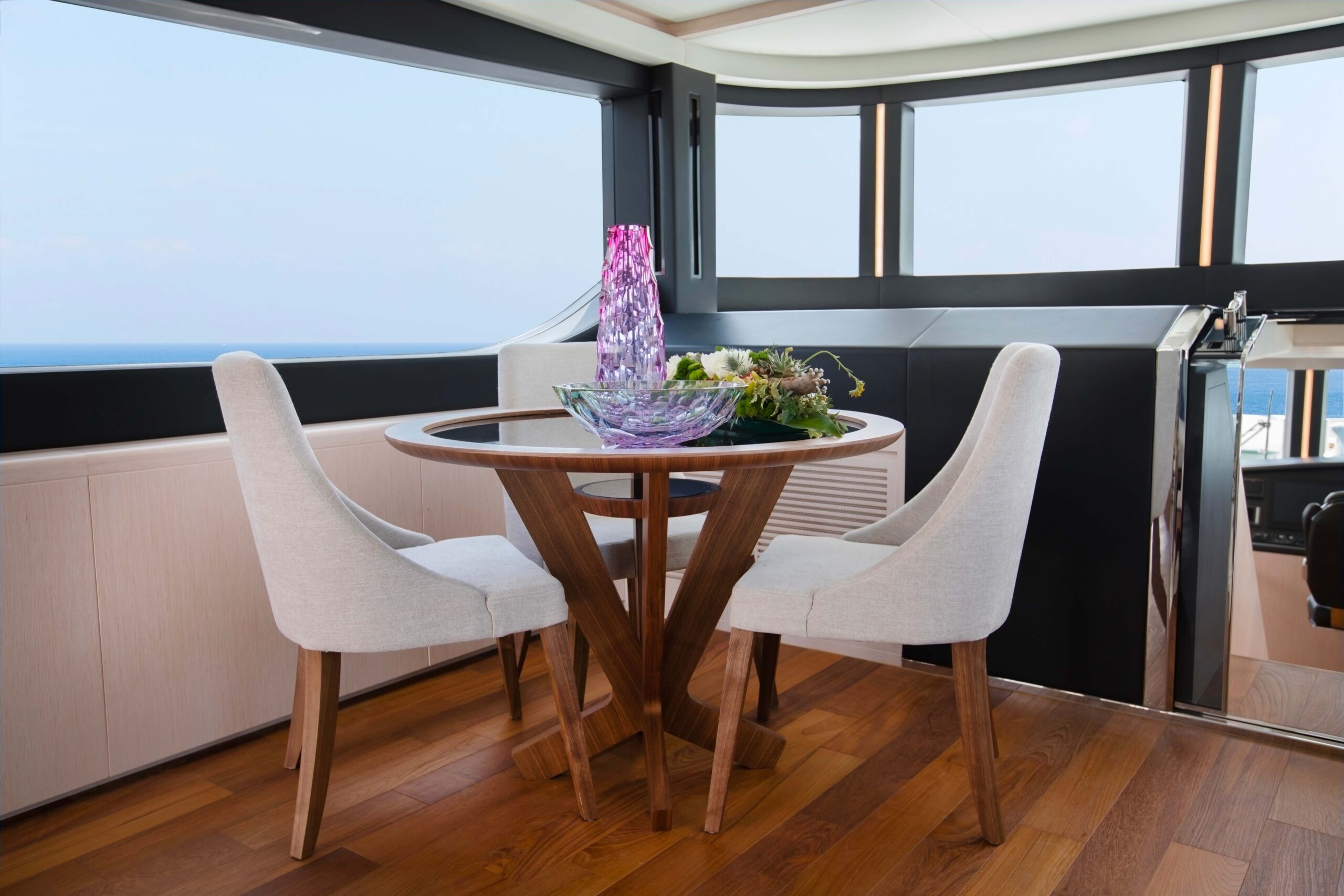 She is a Majesty 100 model and makes an ideal choice for charter vacations thanks to her expansive decks, additional interior sky lounge and efficient cruising consumption. She can accommodate up to 12 charter guests in five suites (2 convertibles have Pullman bunks) with six crew on board.