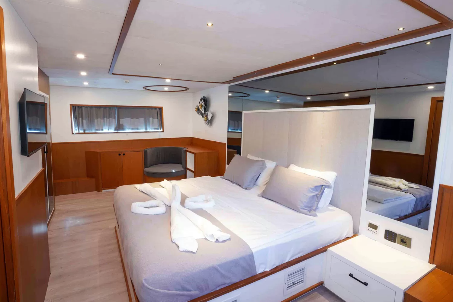 The accommodation is spread across all three levels with a master suite on both the upper deck and forward on the main deck. These suites are very generously sized with plenty of amenities including ensuite bathrooms.