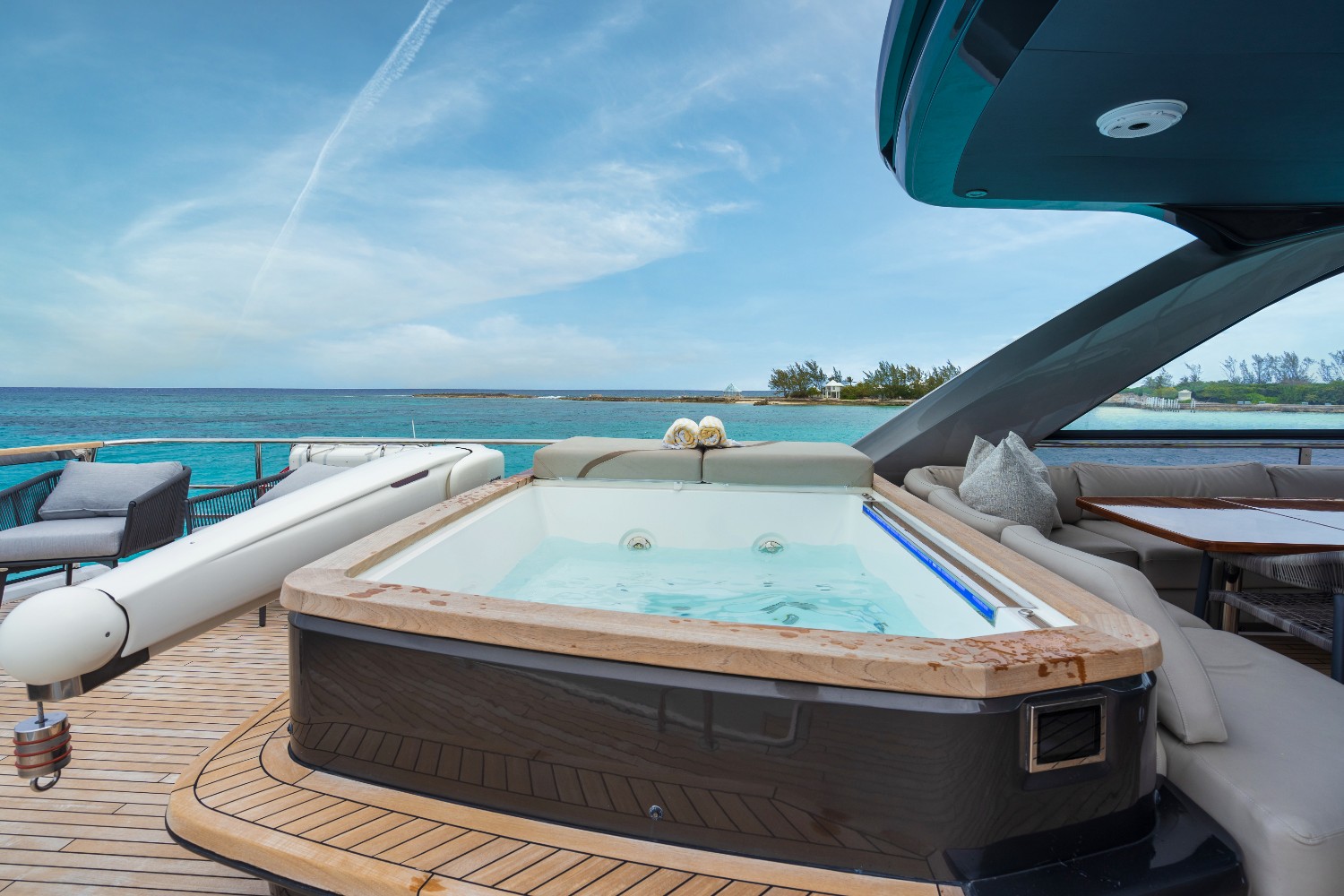 NOTABLE FEATURES OF KAOS: ~Elegant exterior profile ~Expansive flybridge with jacuzzi ~Huge foredeck lounge ~Stabilisers at anchor and underway ~Air conditioning ~WiFi