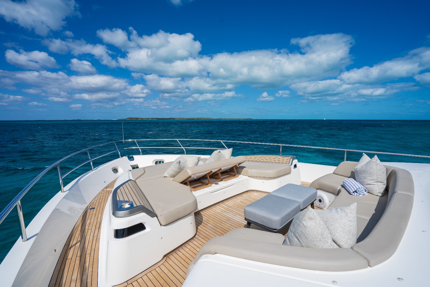 NOTABLE FEATURES OF KAOS: ~Elegant exterior profile ~Expansive flybridge with jacuzzi ~Huge foredeck lounge ~Stabilisers at anchor and underway ~Air conditioning ~WiFi
