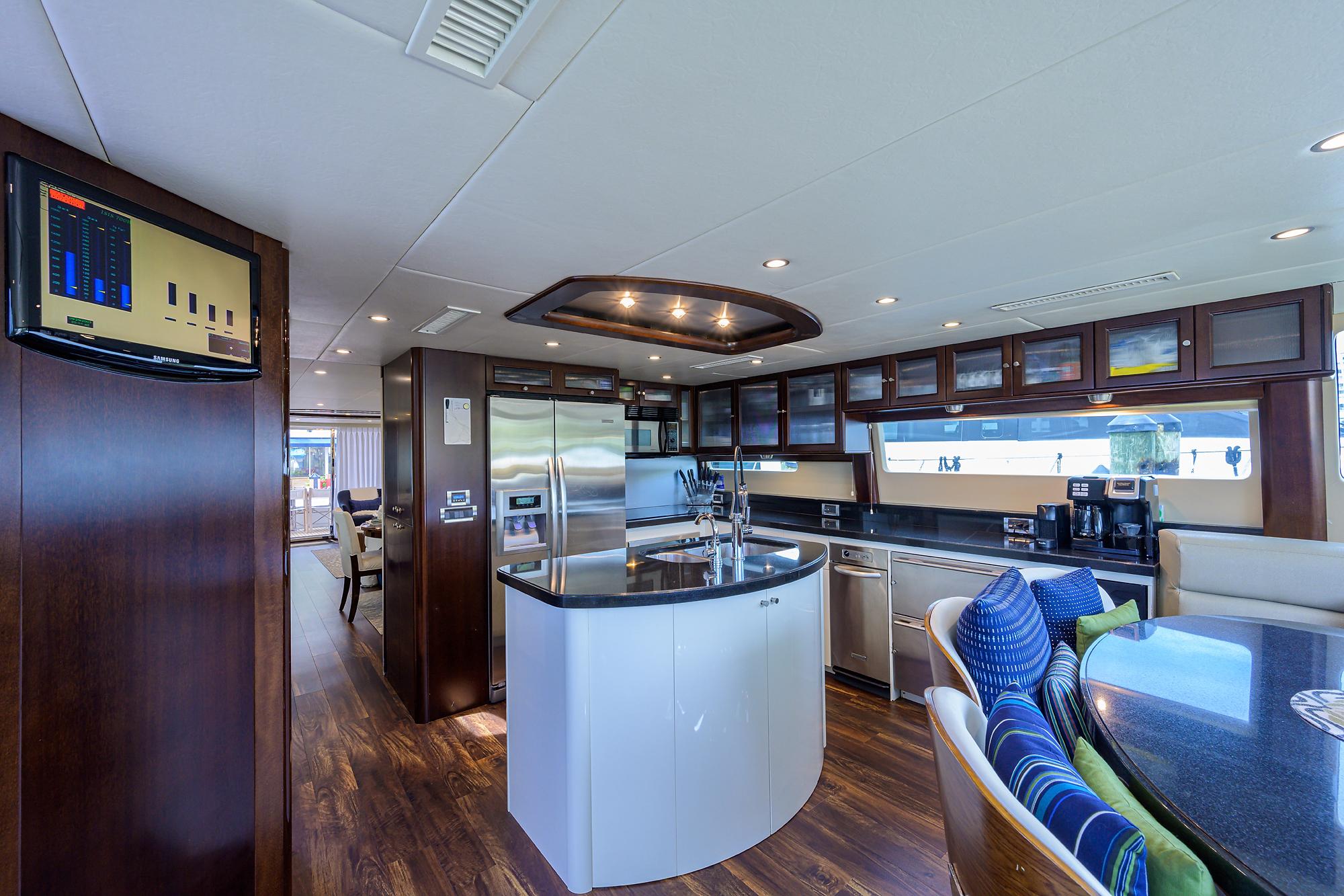 As you enter from the main deck aft there is a generous lounge with a selection of sofas, amidships is the formal dining area while the forward space is a semi-open dine-in galley with views over the bow.