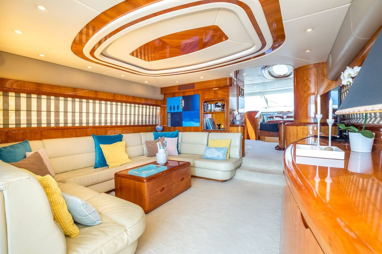As you enter the main salon from the aft deck there is a comfortable u-shaped leather sofa and coffee table to port and gentle steps up to the forward dining area to starboard. Further forward is another curved sofa adjacent to the main helm controls.